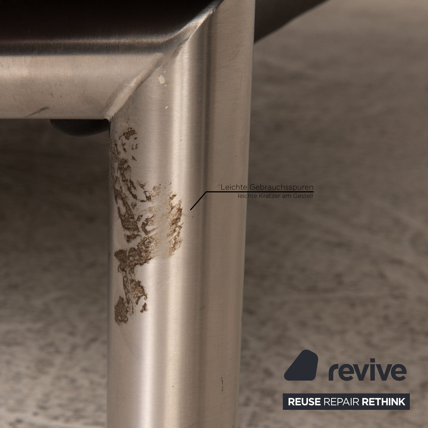 Der Zweisitzer DS 450 von de Sede ist mit einem schwarzen Echtleder bezogen und steht auf schmalen, silbernen Metallfüßen. Er zeichnet sich durch das gradlinige, kantige Design und die komfortable Relaxfunktion aus.