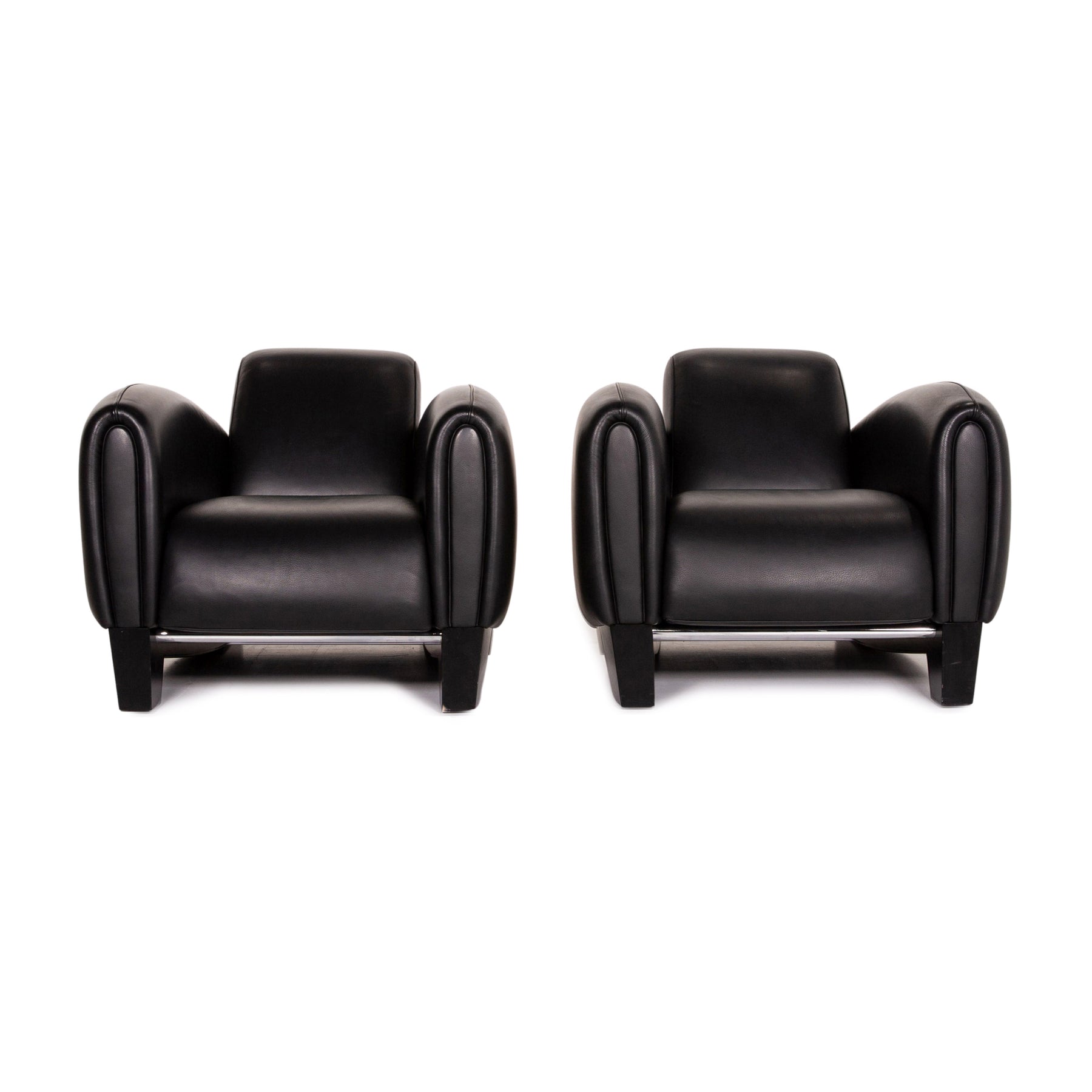 Der Sessel DS 57 von de Sede ist mit einem schwarzen Echtleder bezogen und steht auf markanten Füßen. Weiche Polster sorgen für Komfort. Die aerodynamische Form und das starke Sitzgefälle zeichnen das Möbel aus und sorgen für Retrocharme. Das Set besteht auf zwei Sesseln.