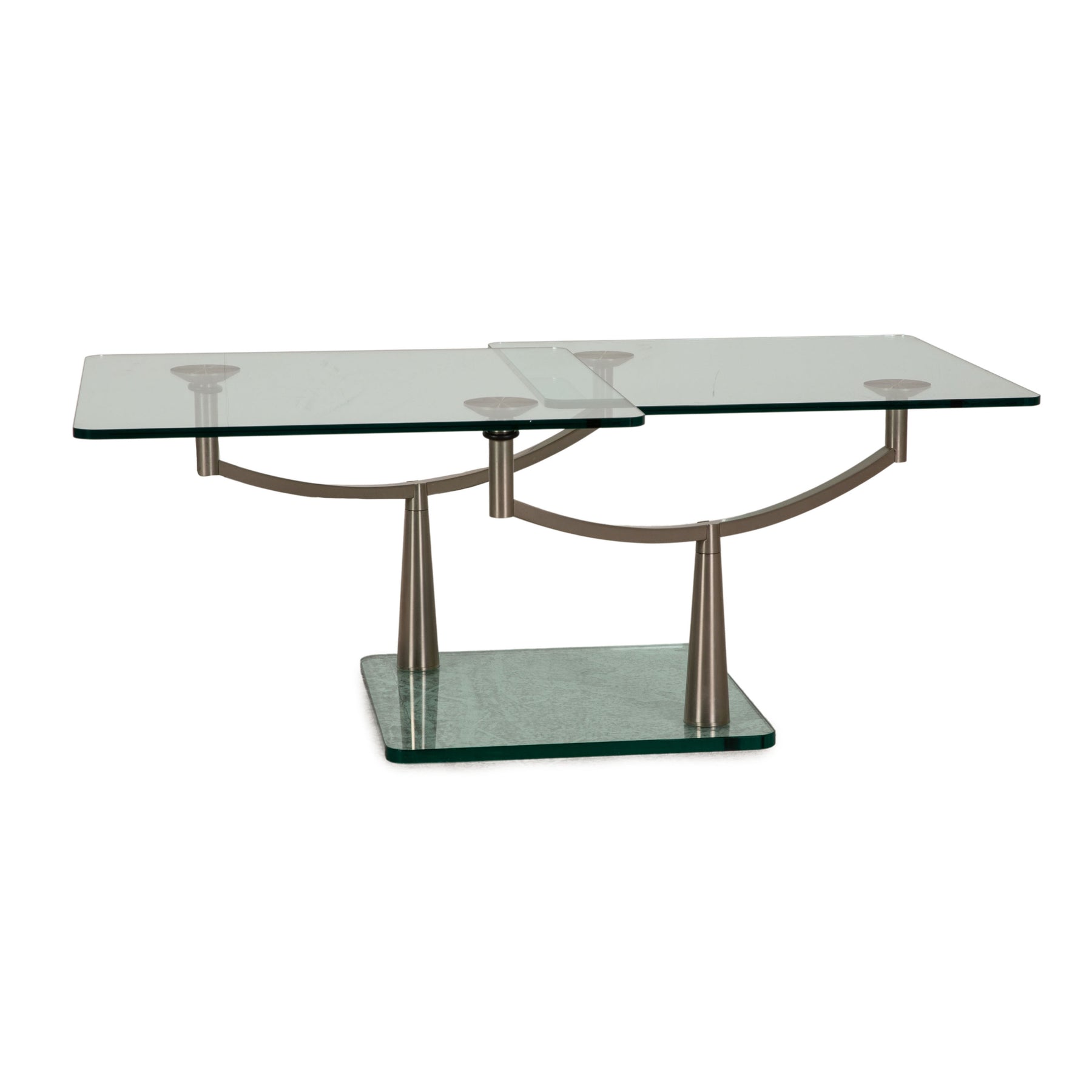 Der Waage Tische von Draenert besteht aus zwei quadratischen Glasplatten, die auf einem edlen, verstellbaren Metallgestell befestigt sind. Das moderne Design zeichnet den Couchtisch aus.