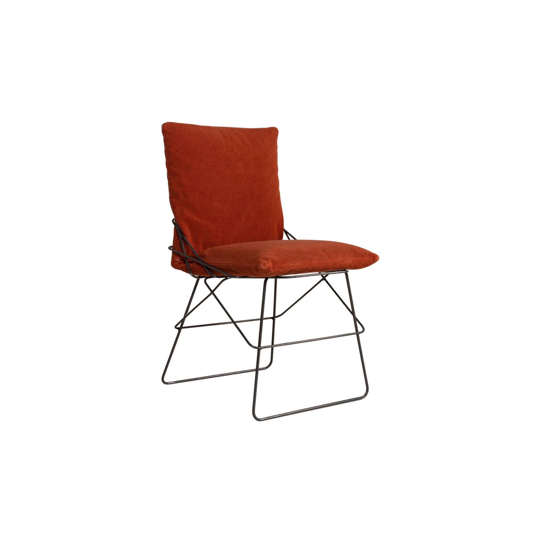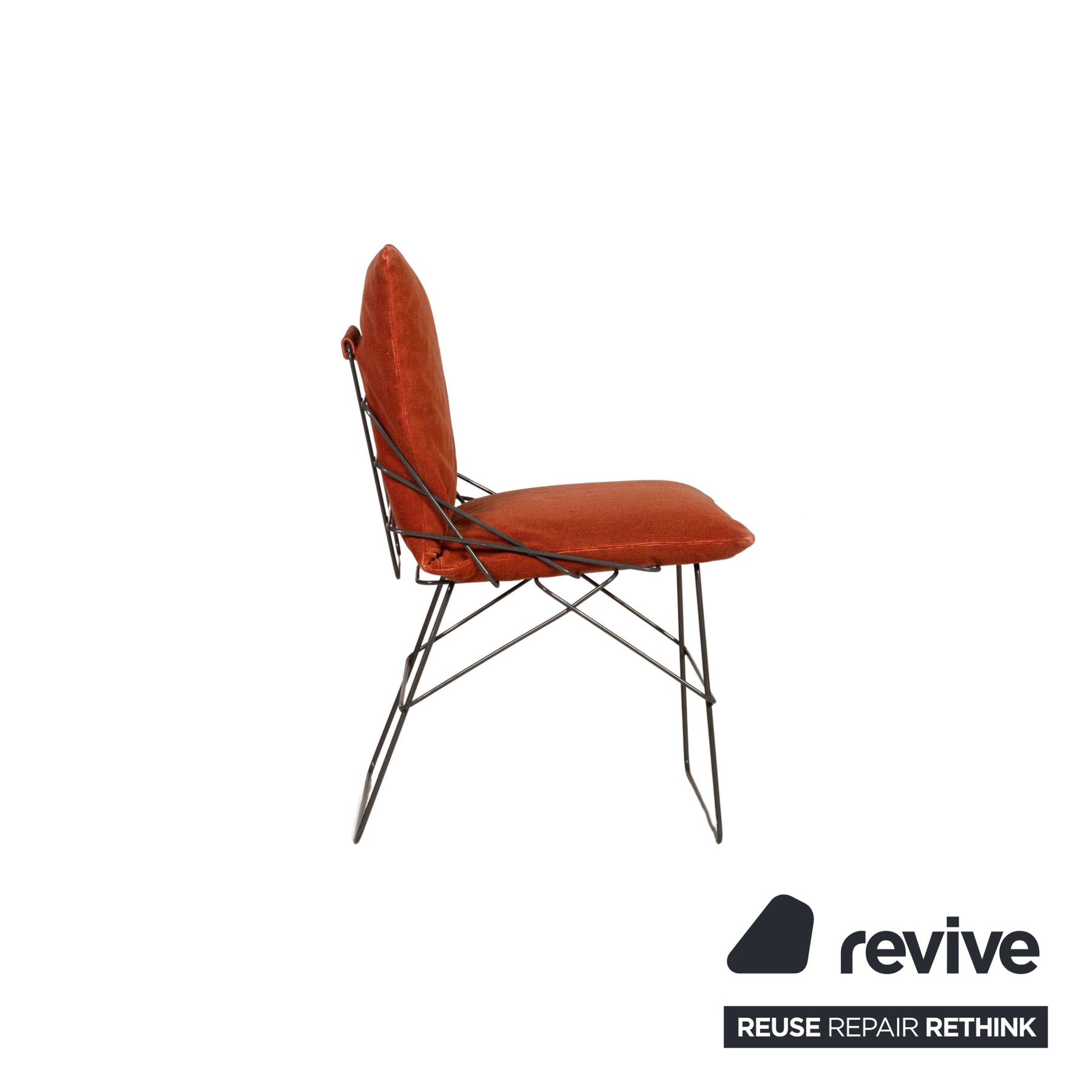 Der SOF SOF Stuhl von Driade ist mit einem orangefarbenen Stoff bezogen und steht auf einem Gestell aus pulverbeschichtetem Stahlrohr. Er überzeugt durch die harmonischen Linien und das zeitlose Design.
