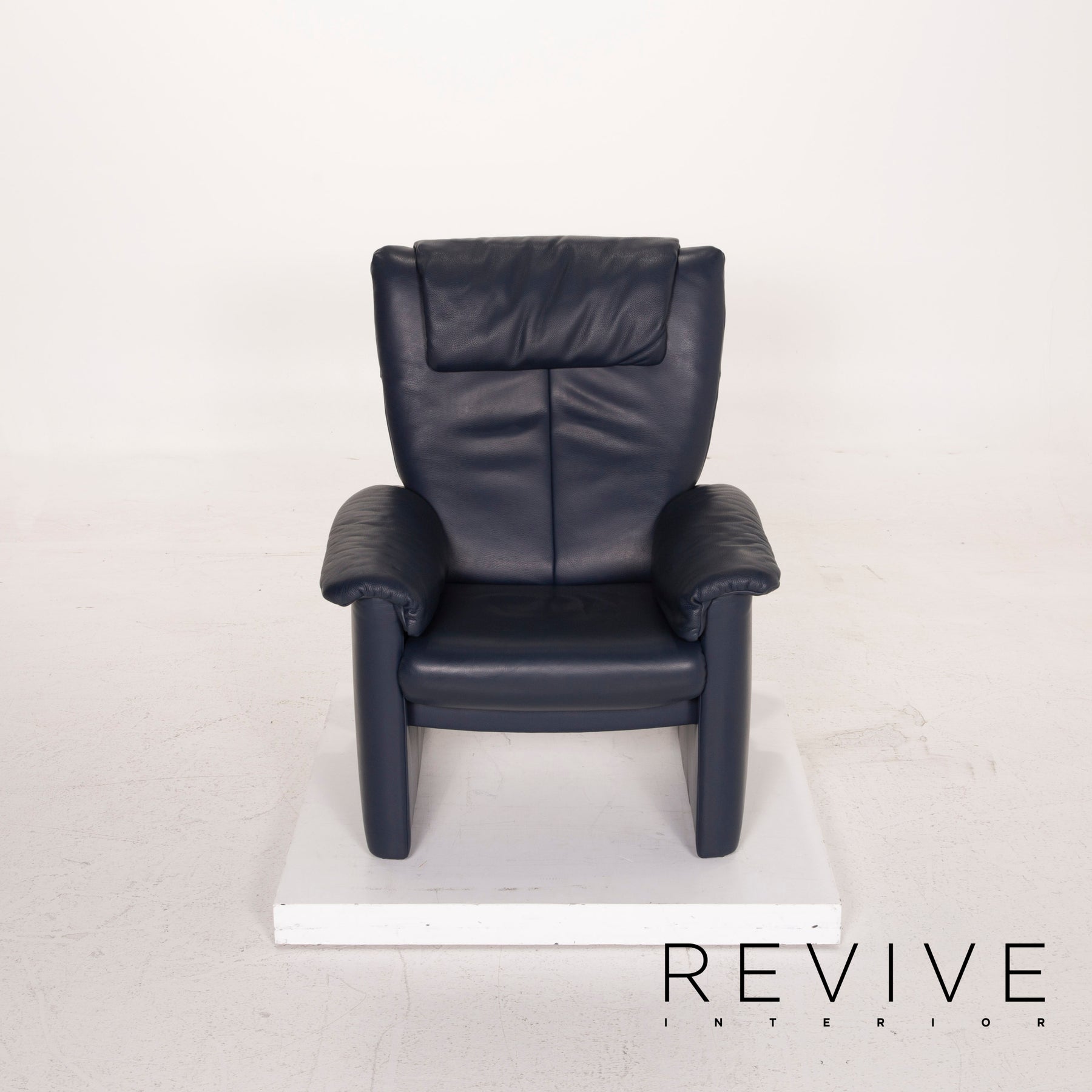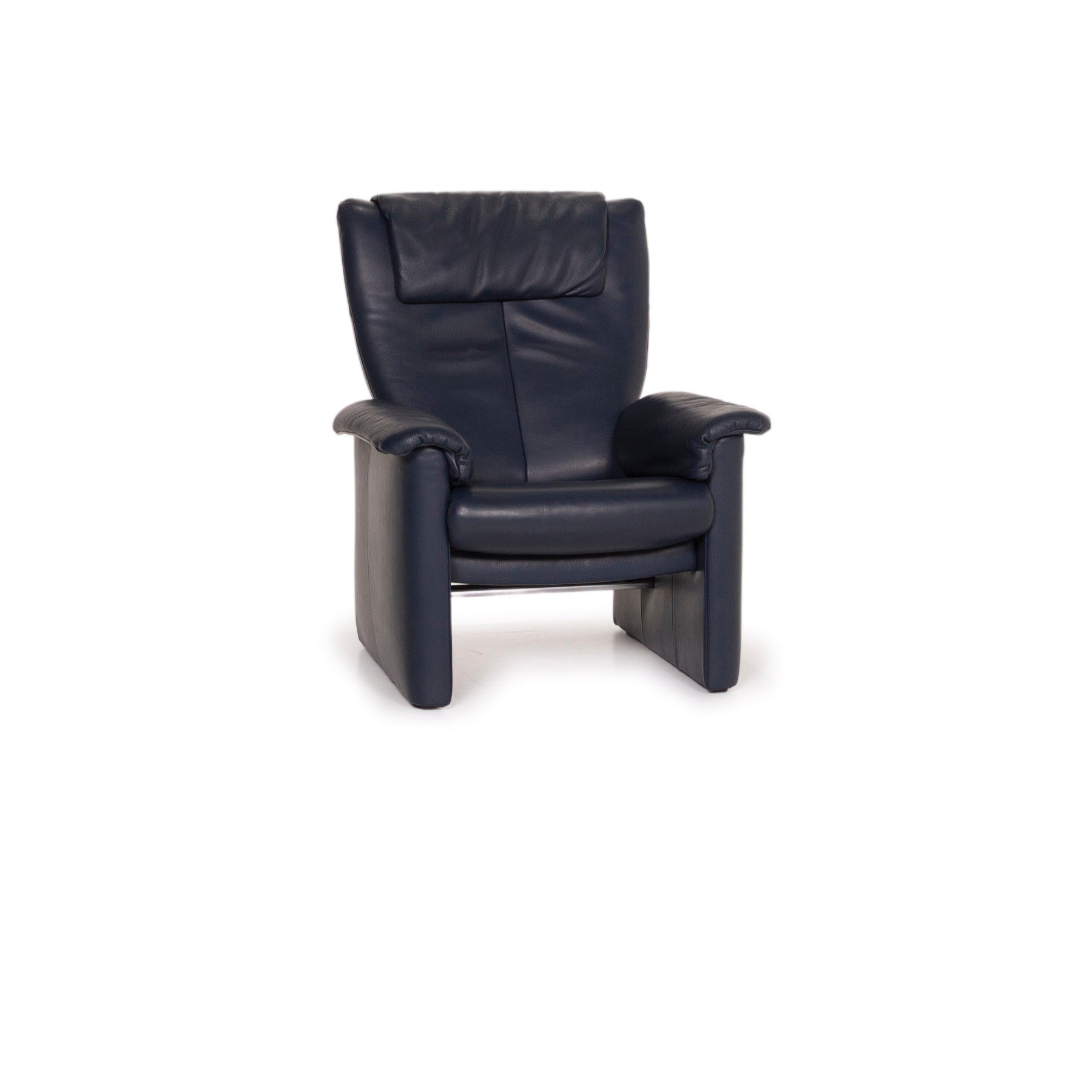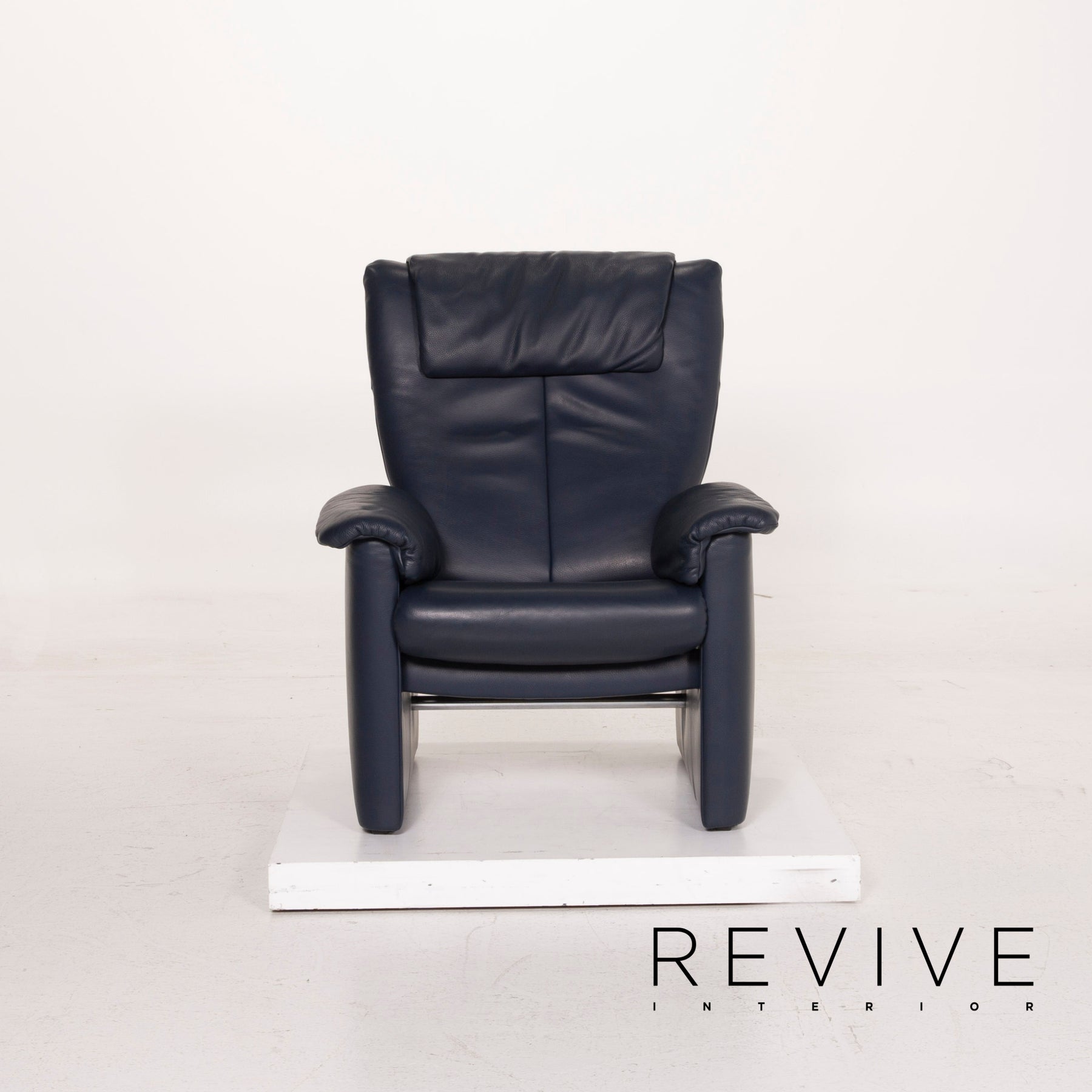 Der Sessel aus dem Hause Erpo ist mit blauem Leder bezogen. Die Rückenlehne ist verstellbar, so dass eine Relaxfunktion eingenommen werden kann.