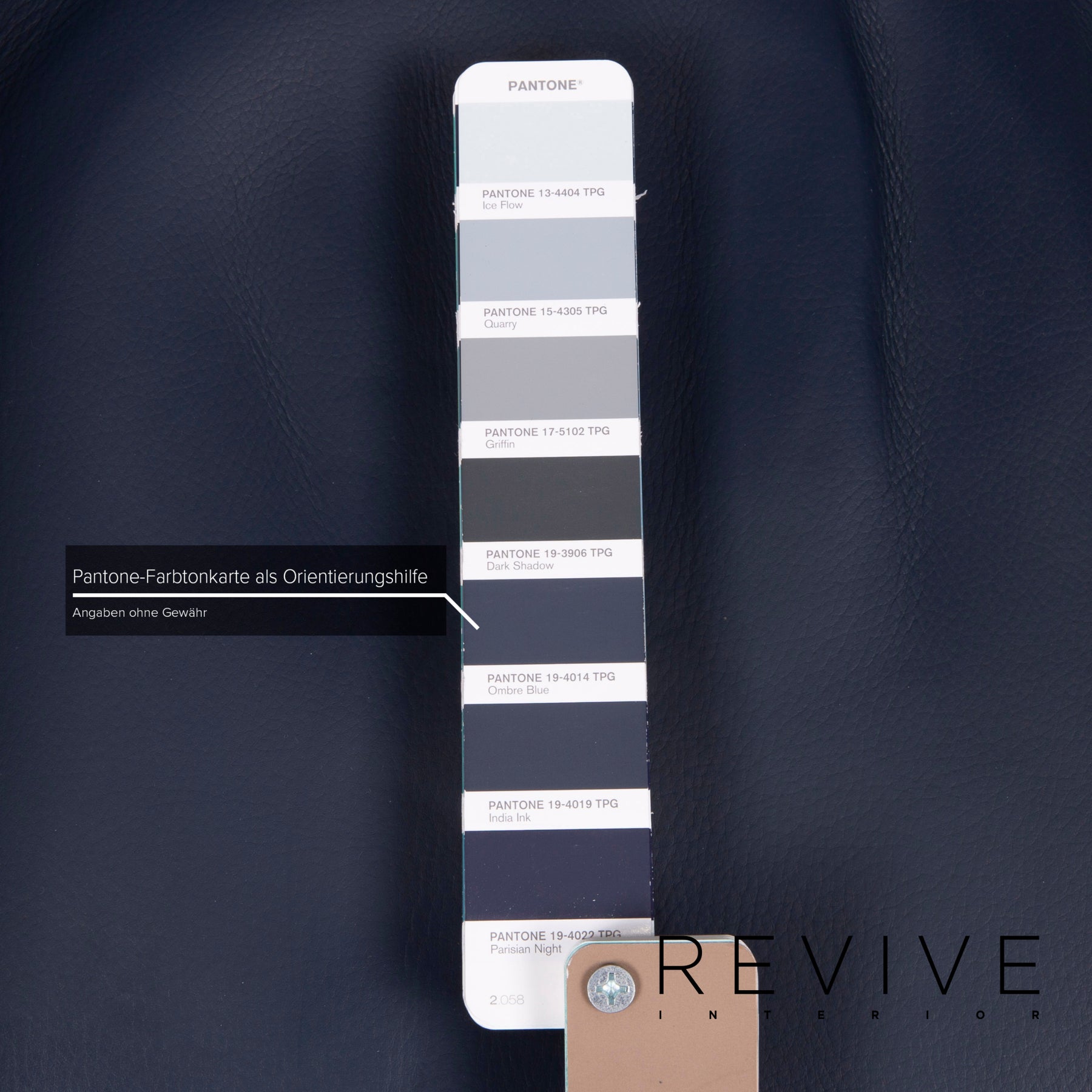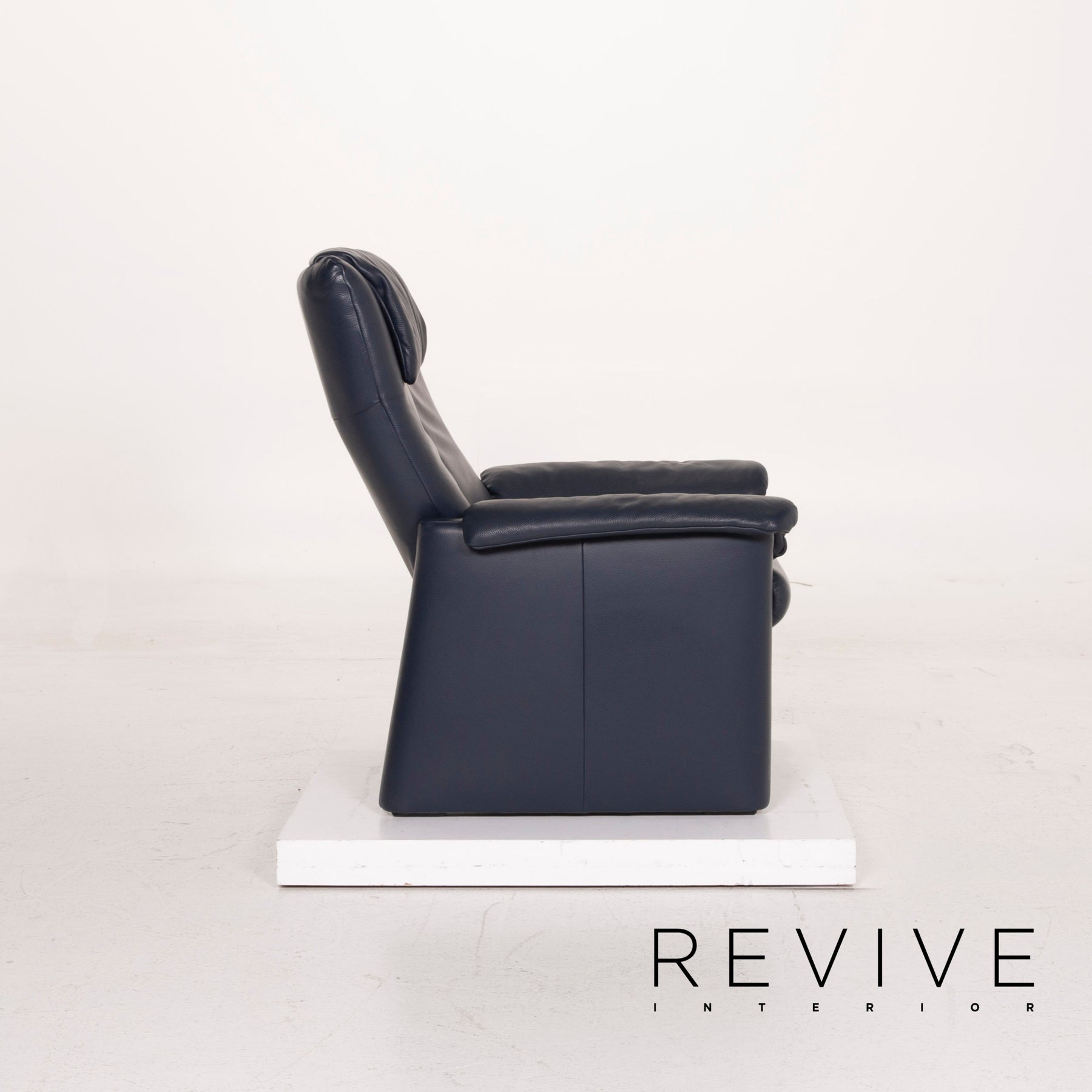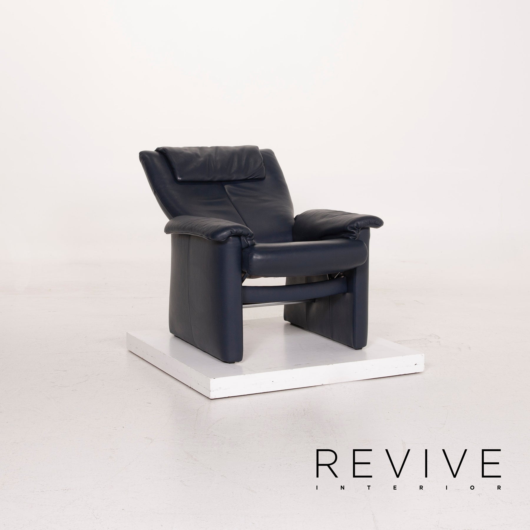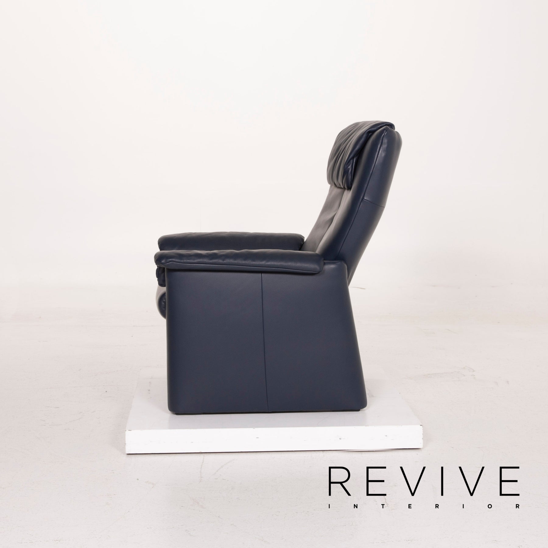 Der Sessel aus dem Hause Erpo ist mit blauem Leder bezogen. Die Rückenlehne ist verstellbar, so dass eine Relaxfunktion eingenommen werden kann.