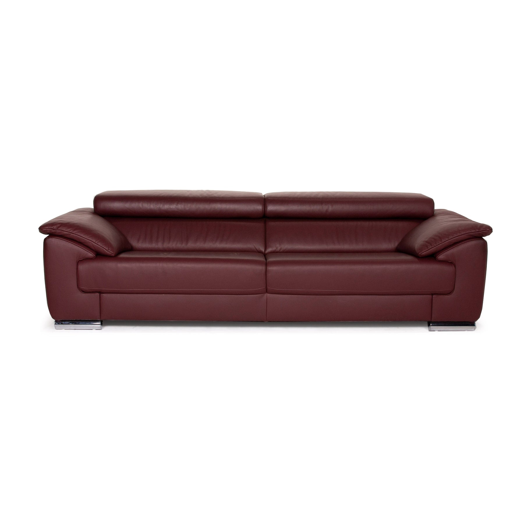 Der Dreisitzer in dunkelrotem Leder von Ewald Schillig kommt im klassischen Design des Herstellers daher - markante Polsterung, breite Armlehnen und Metallfüße. Die Kopfteile sind verstellbar.