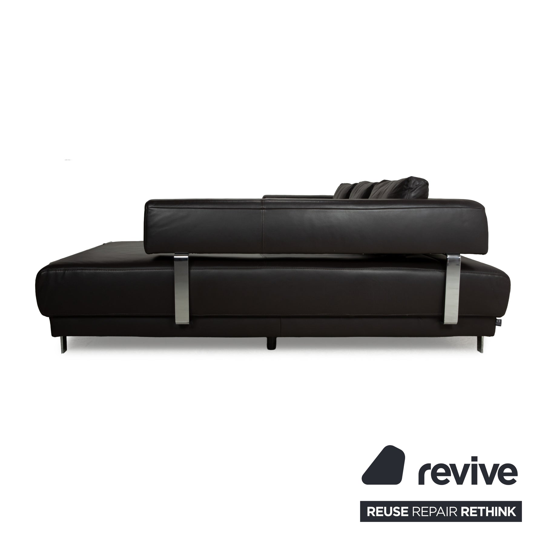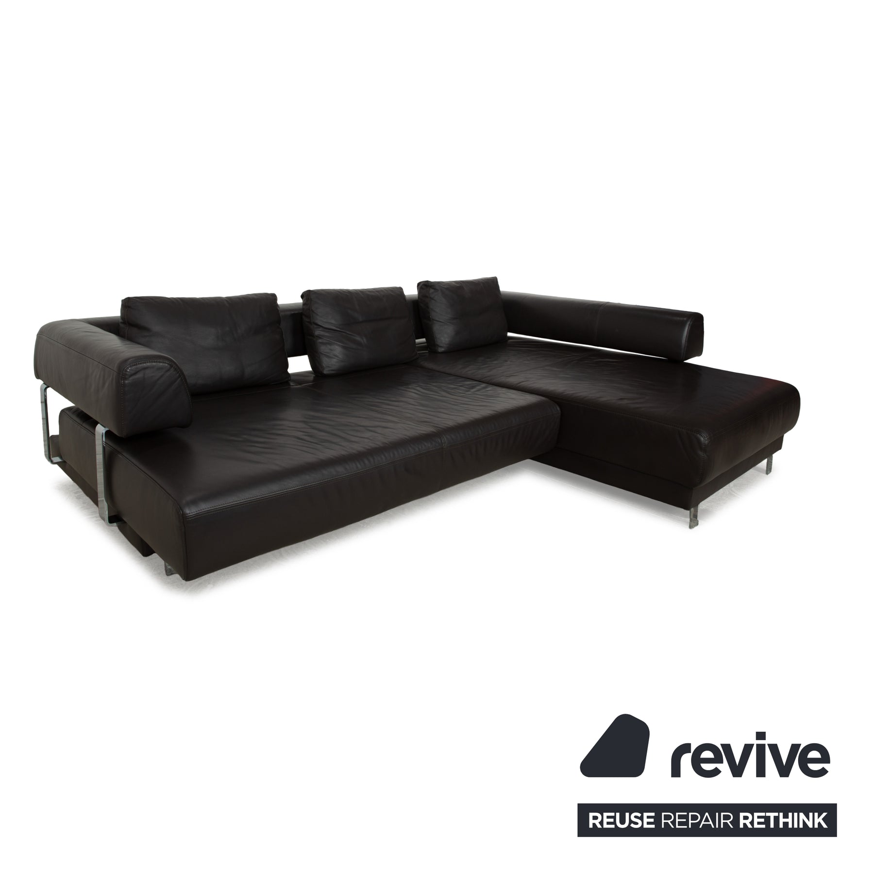 Das Ecksofa Brand Face von Ewald Schillig ist mit dunkelbraunem Leder bezogen und steht auf hochglänzenden Metallfüßen. Die gelungene Kontrastierung von Metall und Leder sorgt für einen spannenden Look. Das Sofa bietet in Grundposition durch tiefe Sitzflächen und große Rückenlehnenkissen bereits hohen Komfort, welcher durch die manuell noch erweiterbare Sitztiefe noch erhöht wird.