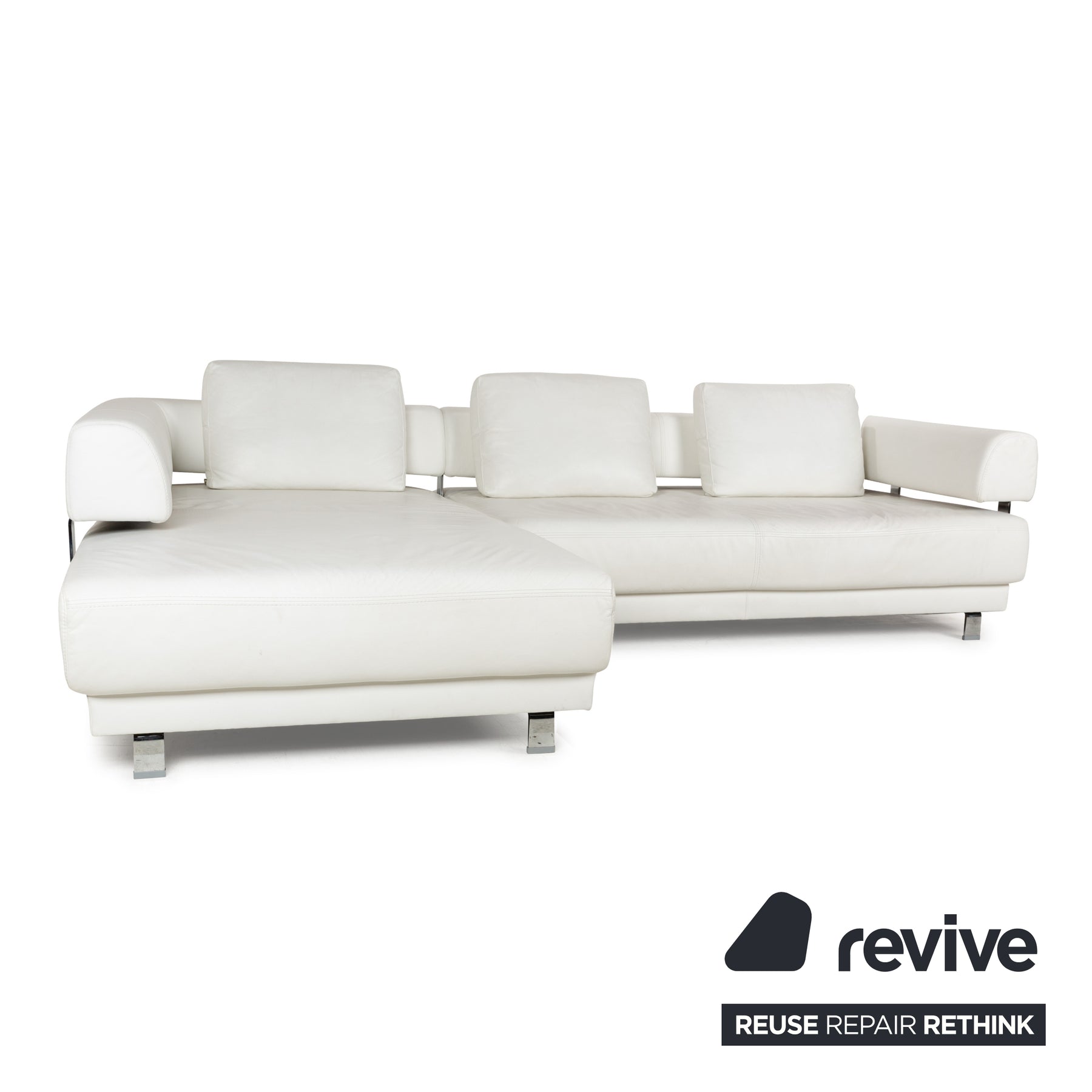 Das Ecksofa Brand Face von Ewald Schillig ist mit weiß-cremefarbenen Leder bezogen und steht auf hochglänzenden Metallfüßen. Die gelungene Kontrastierung von Metall und Leder sorgt für einen spannenden Look. Das Sofa bietet in Grundposition durch tiefe Sitzflächen und große Rückenlehnenkissen bereits hohen Komfort, welcher durch die elektrisch noch erweiterbare Sitztiefe noch erhöht wird.