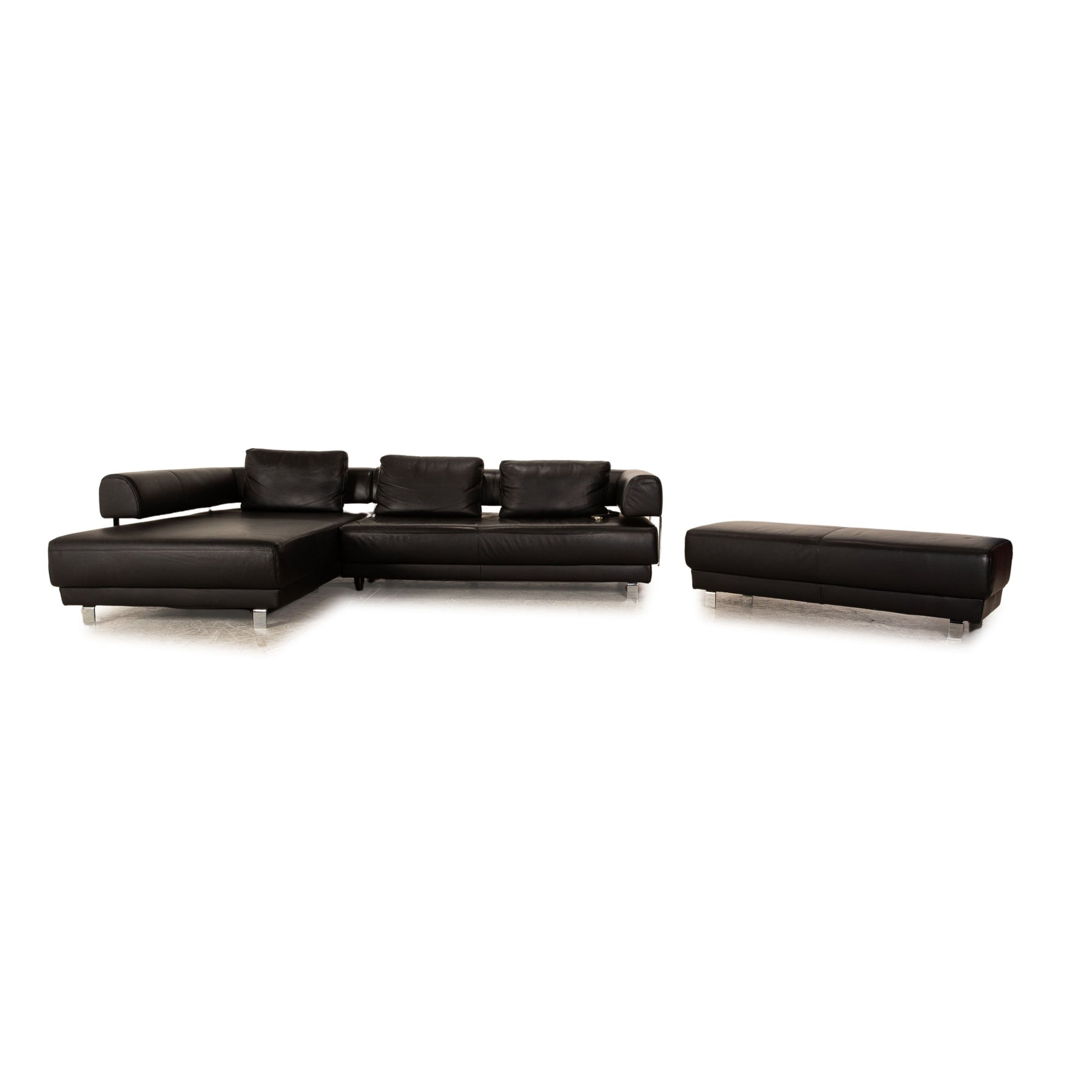 Die Sofa Garnitur Brand Face von Ewald Schillig ist mit einem schwarzen Echtleder bezogen und steht auf silbernen Metallfüßen. Sie zeichnet sich durch das klassische Design und die stilvolle Optik aus. Die Garnitur besteht aus einem Ecksofa und einem Hocker.