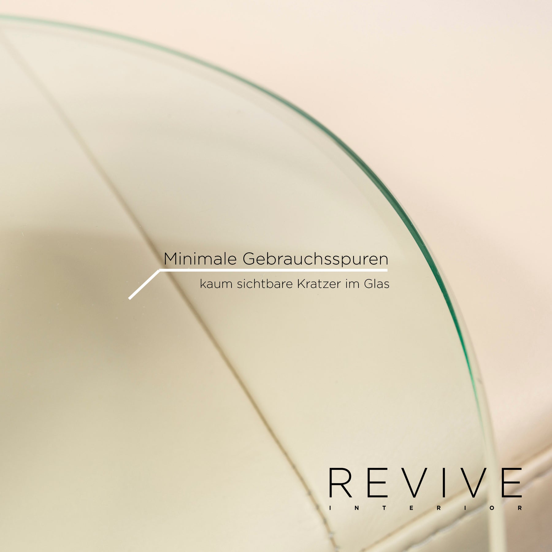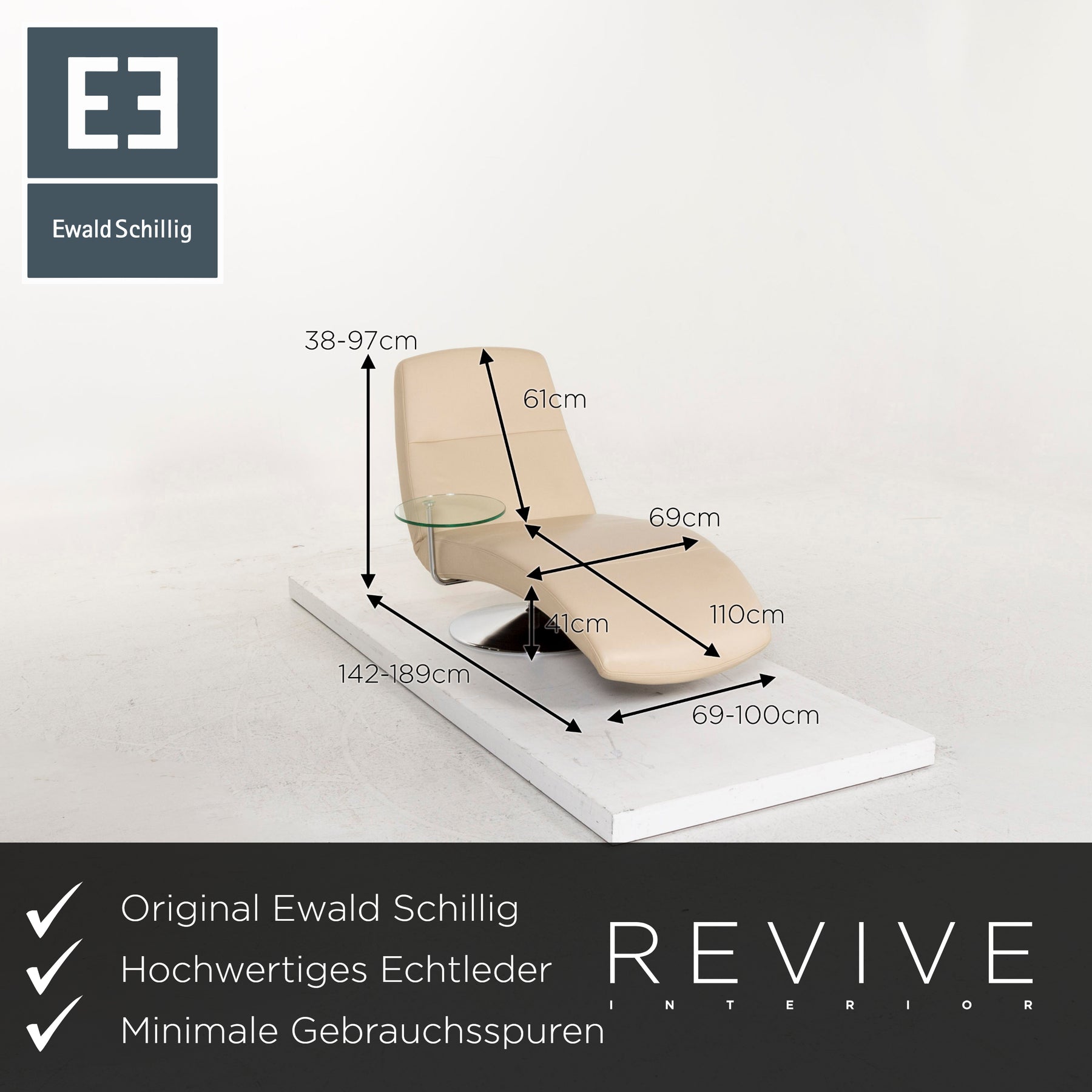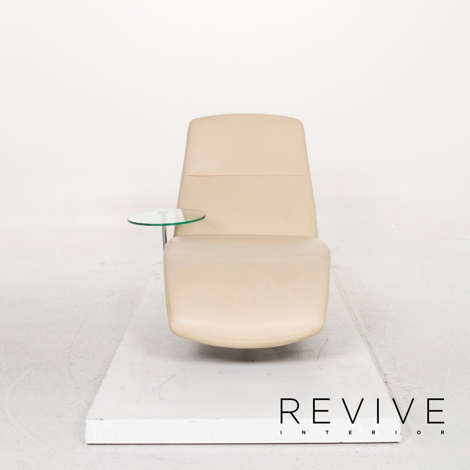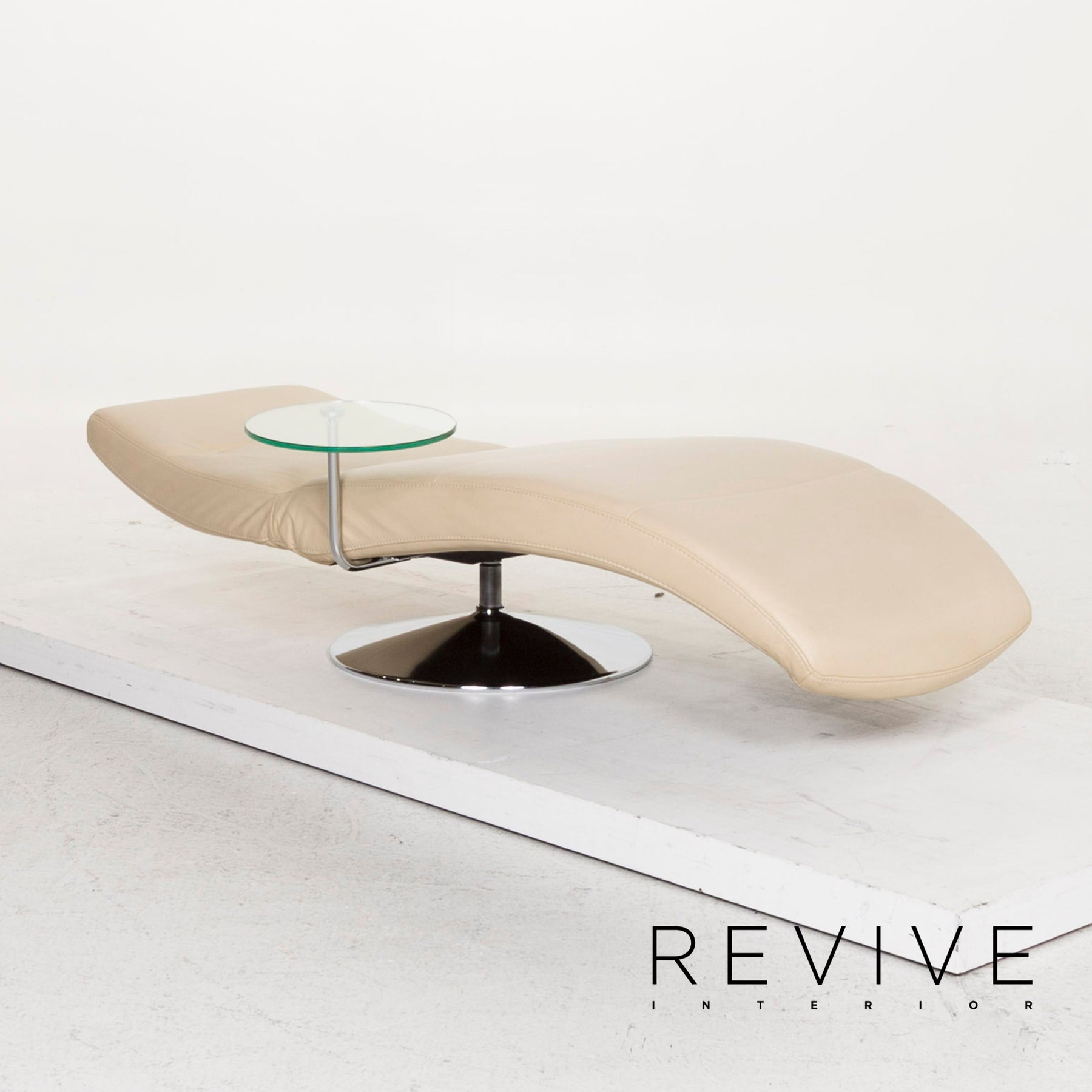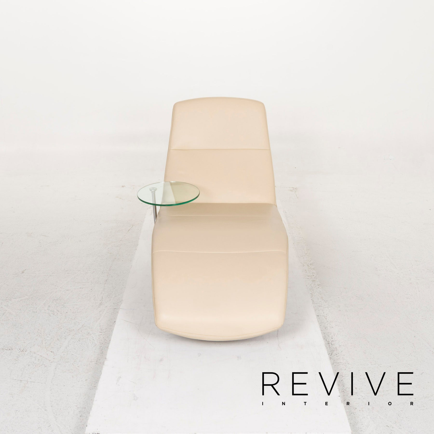 Die Ewald Schillig Liege ist mit einem cremefarbenem Glattleder bezogen. Sie kann in eine Liegeposition gebracht werden und steht auf einem runden Chromfuß. Ein gläserner, sockelloser Beistelltisch ist mit einem verchromten Arm an der Liege befestigt und biete Ablagefläche und Komfort.