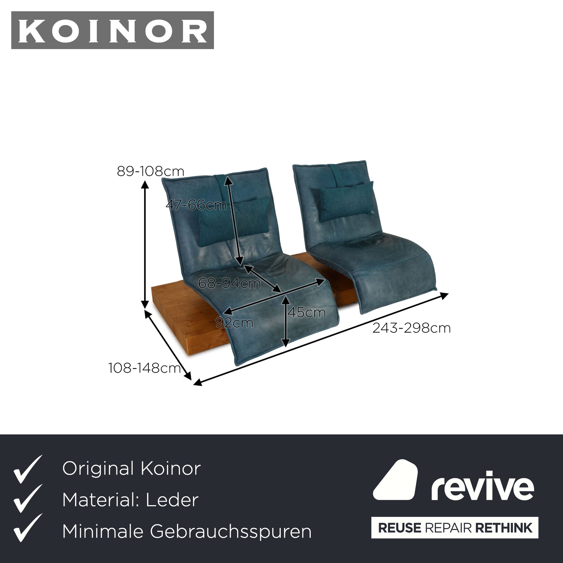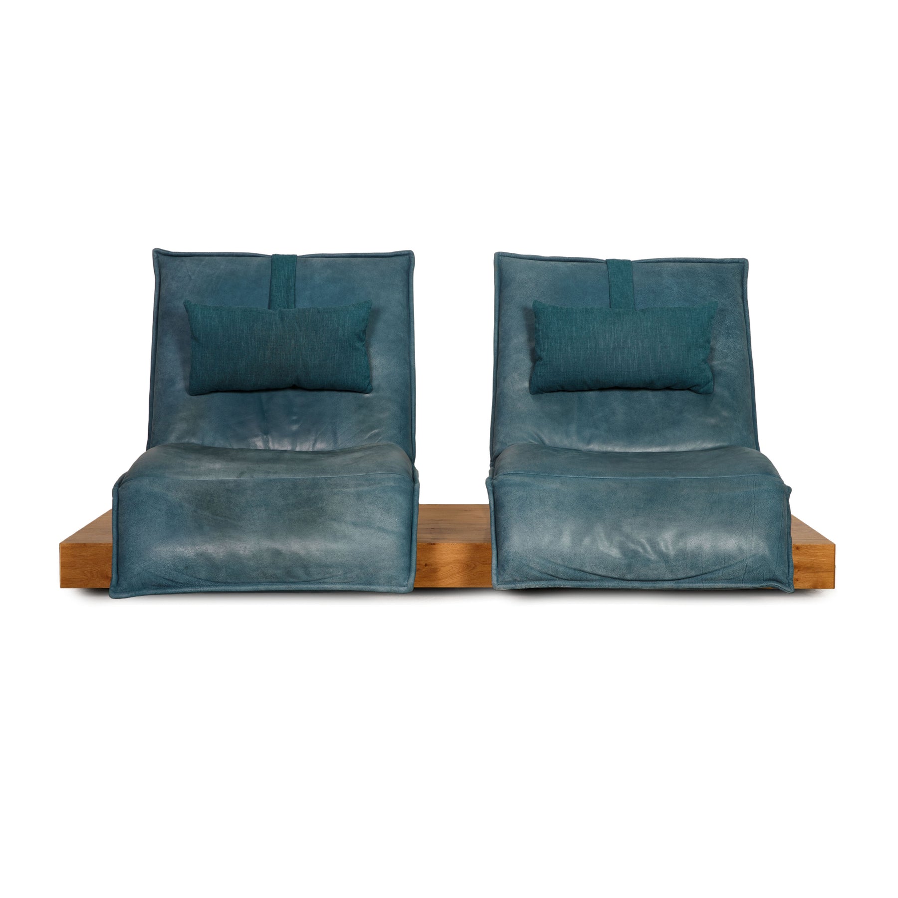 Der Zweisitzer Free Motion Epos 3 von Koinor ist mit einem blauen Echtleder bezogen und steht auf einem Holzpodest. Er zeichnet sich durch die elektrische Relaxfunktion und das moderne Design aus.