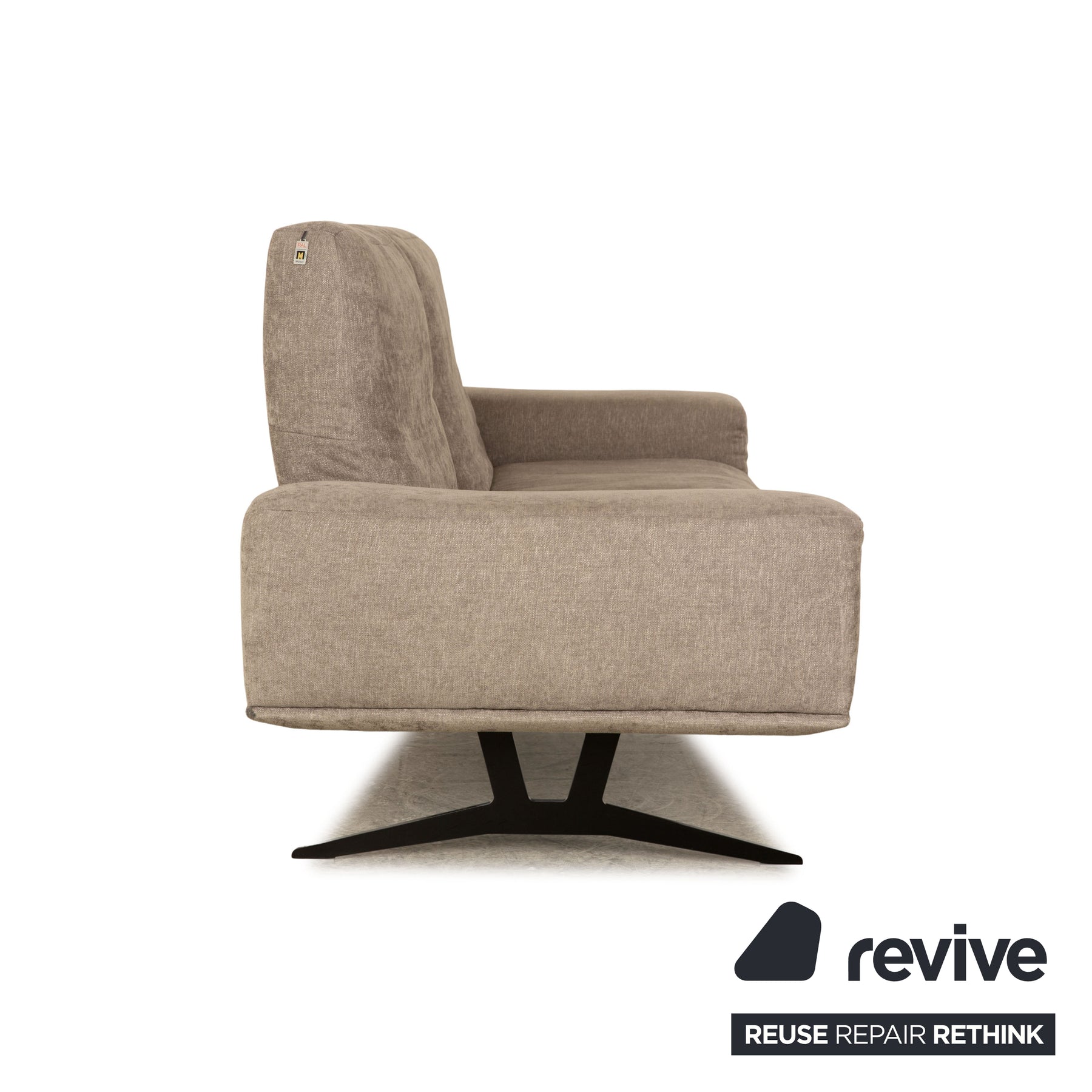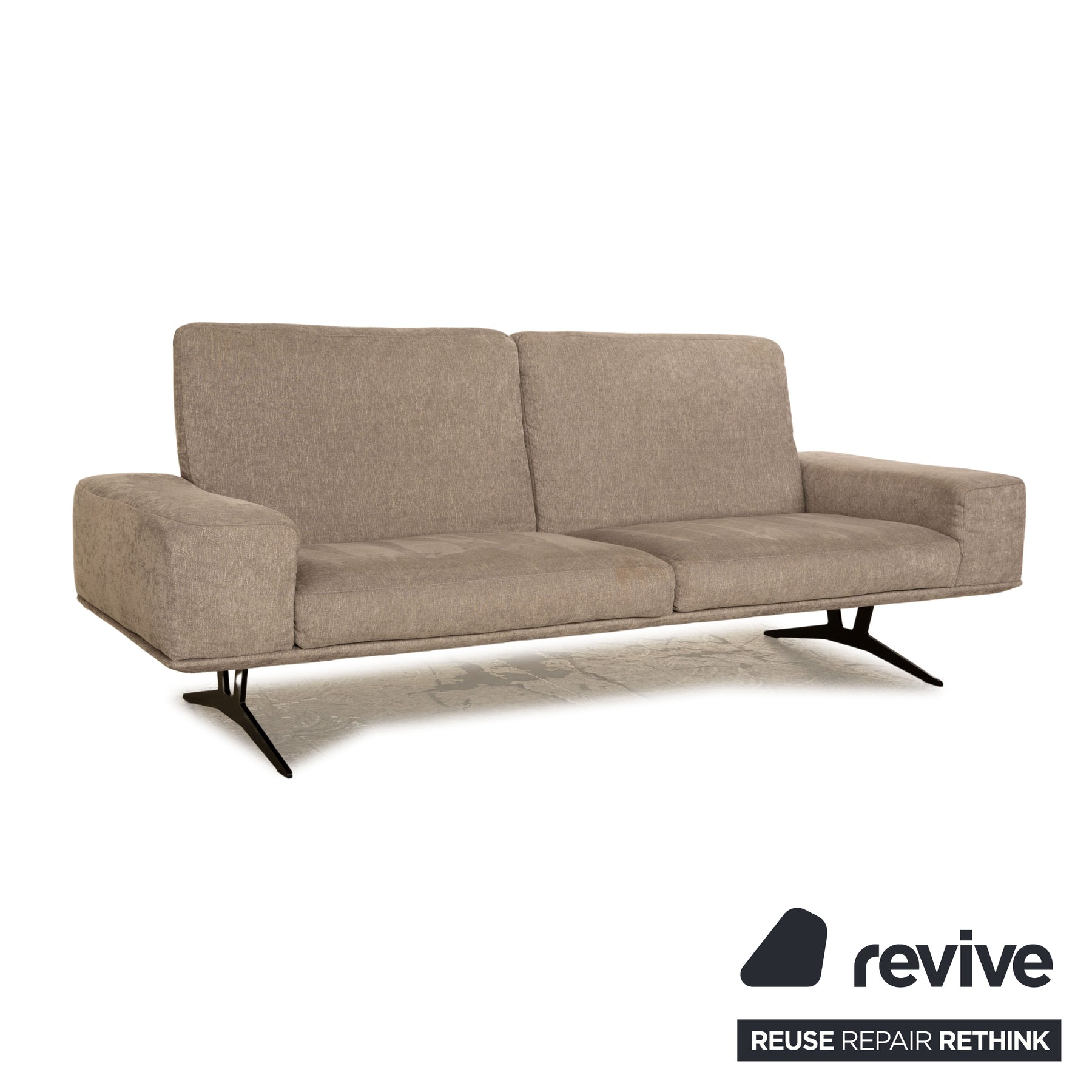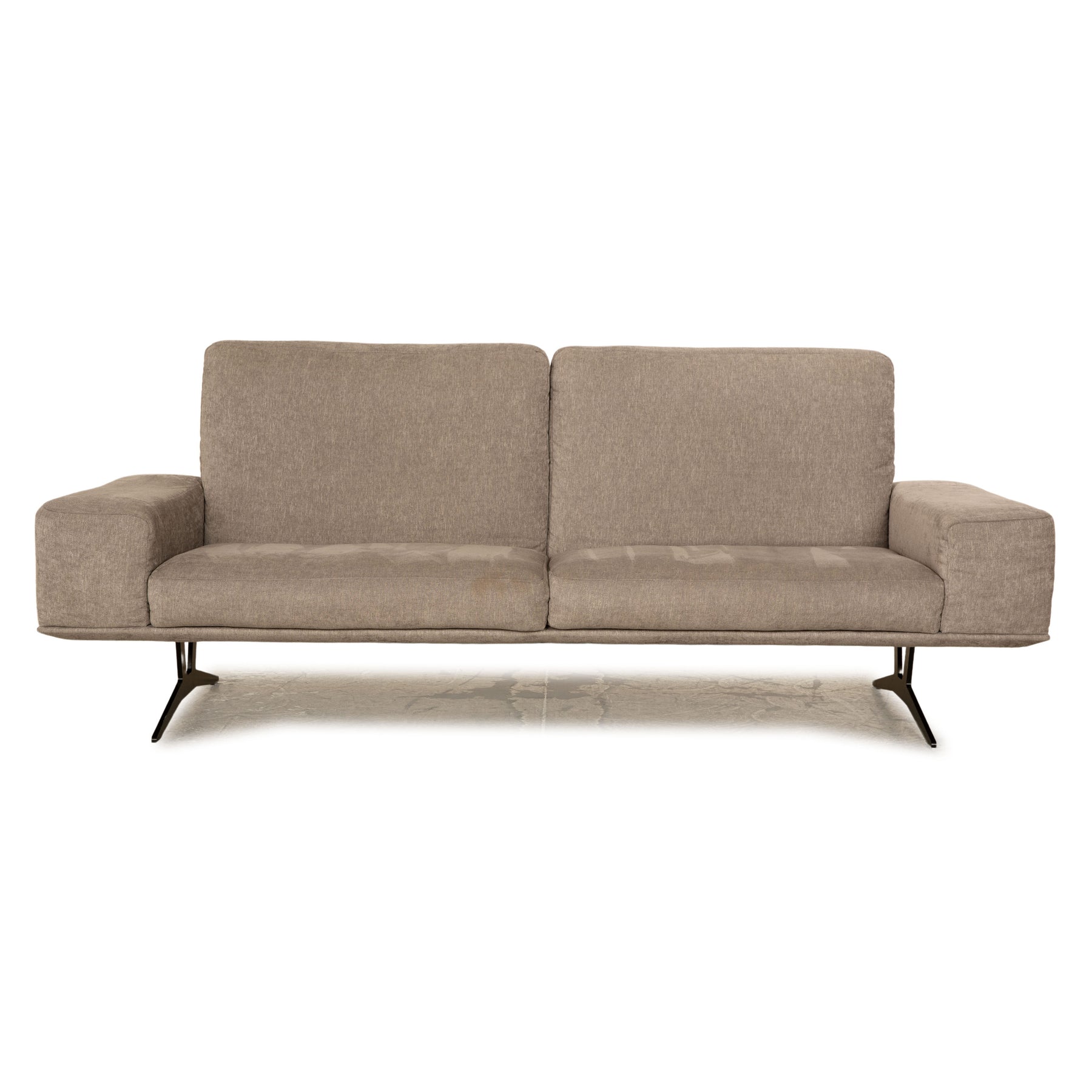 Der Dreisitzer Hiero von Koinor ist mit einem grauen Stoff bezogen und steht auf schwarzen Metallfüßen. Er zeichnet sich durch  das kantige, gradlinige Design und die moderne Optik aus.