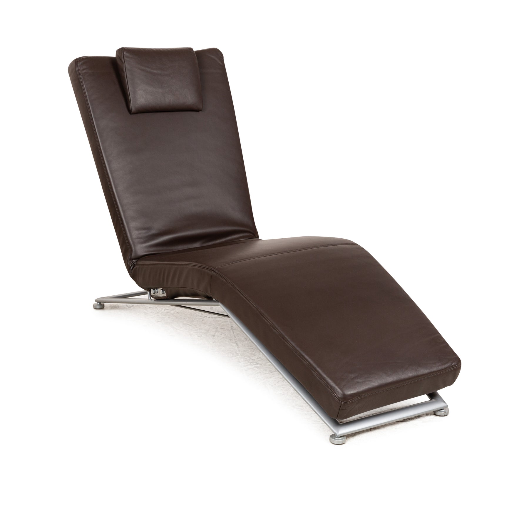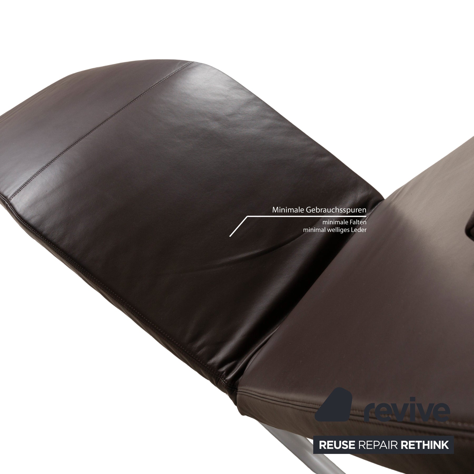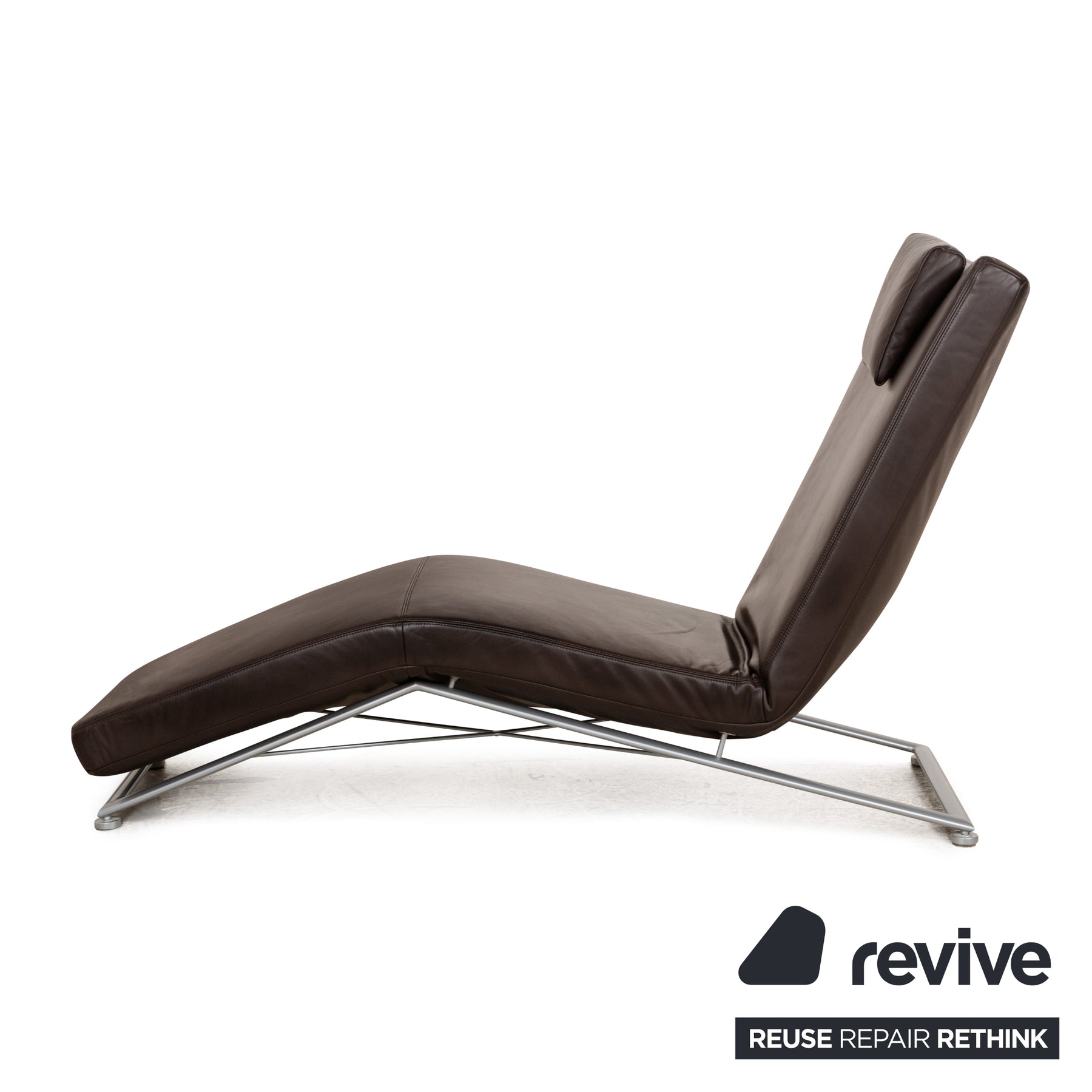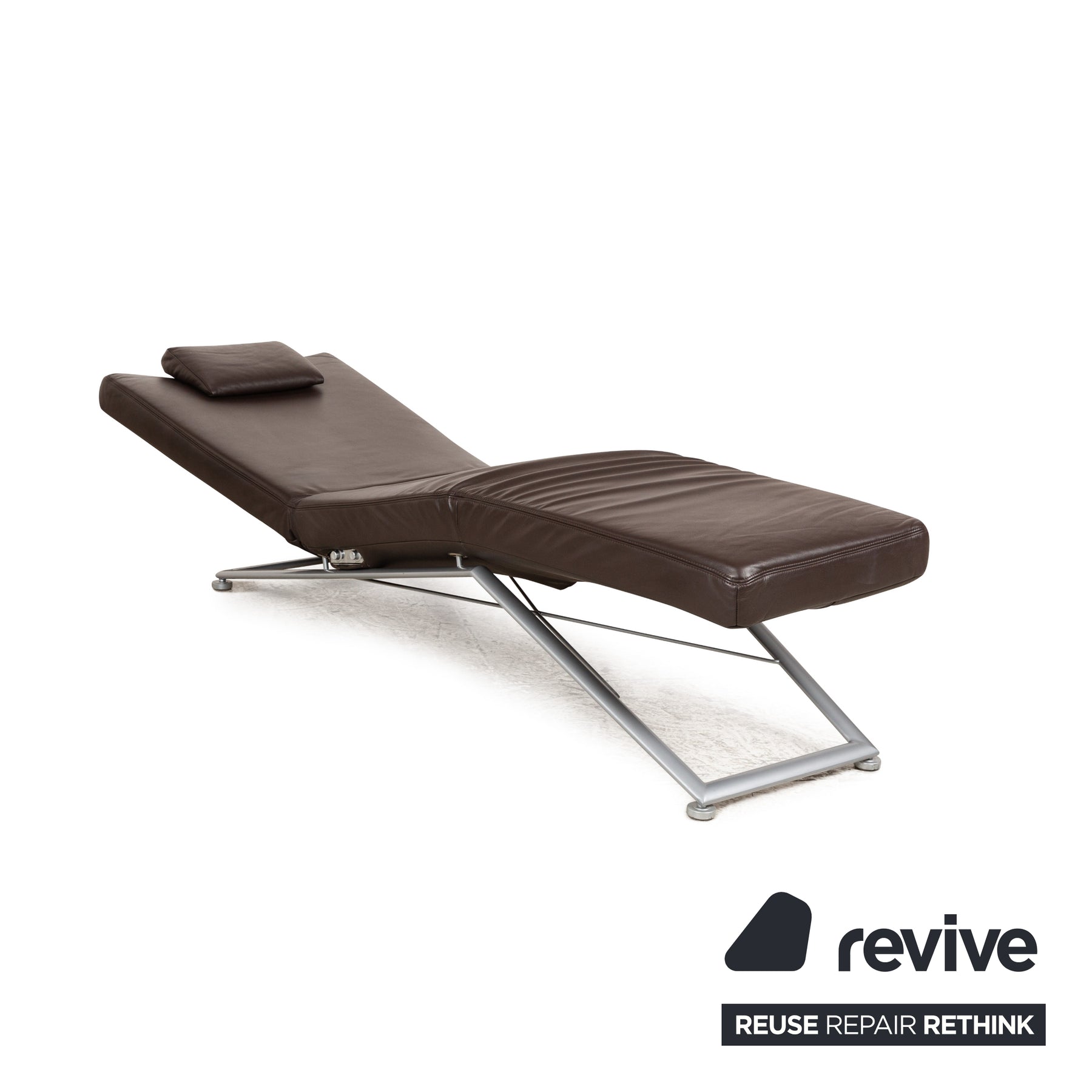 Die Liege Jeremiah vom deutschen Hersteller Koinor ist mit braunem Leder bezogen und steht auf einem filigranen Metallgestell. Eine ergonomische Formsprache und eine schlanke Optik prägen das Design. Für mehr Komfort kann die Liege in eine Relaxposition gebracht werden.