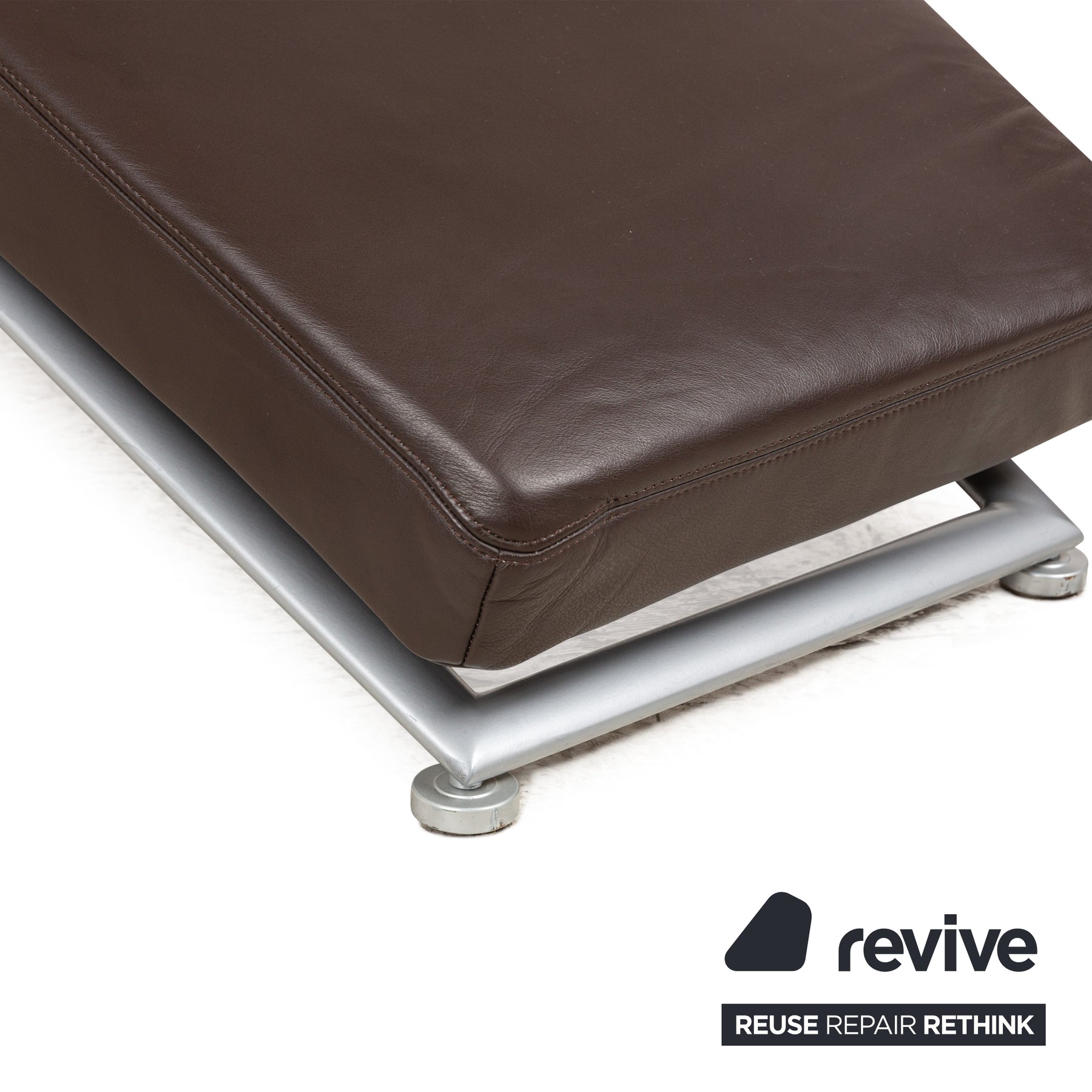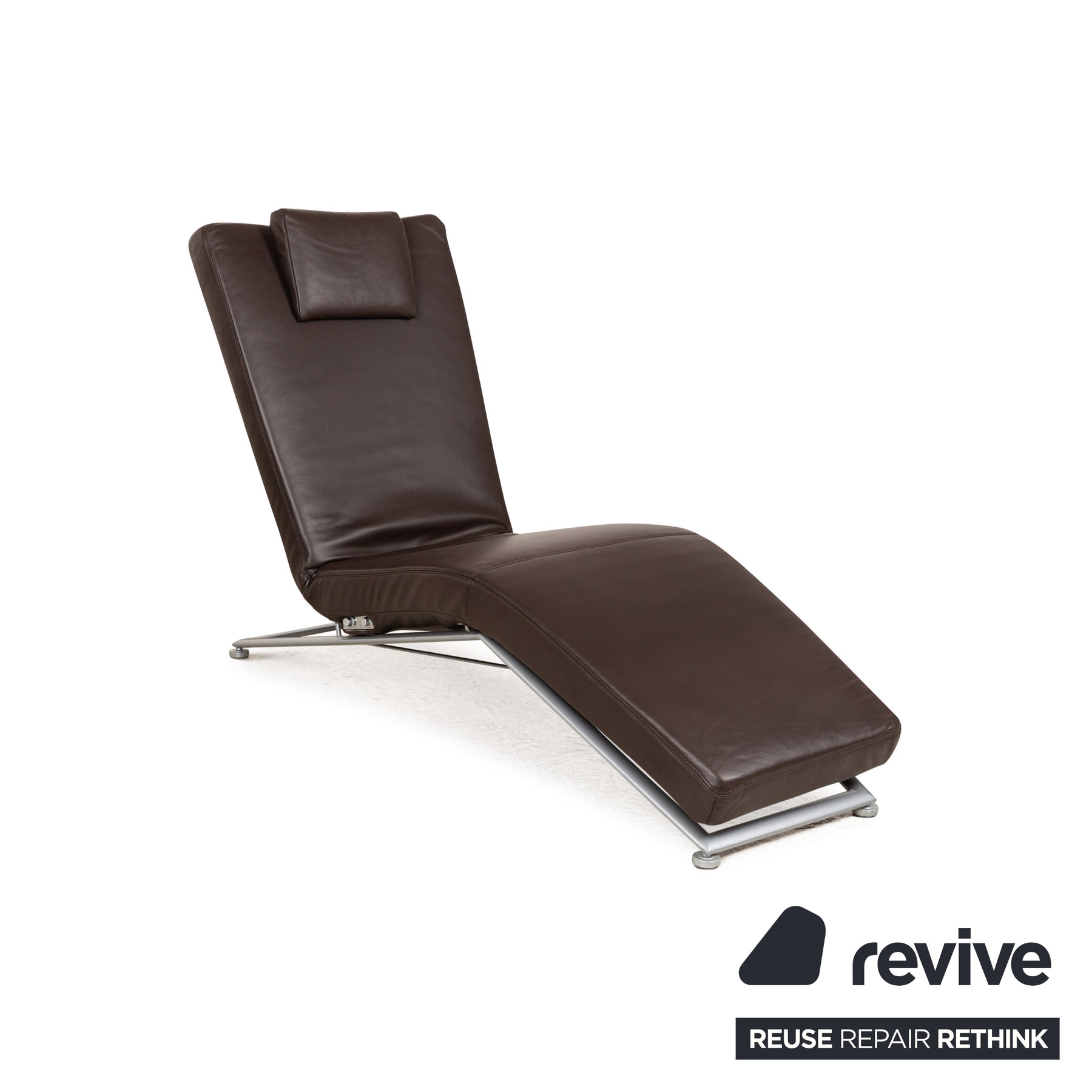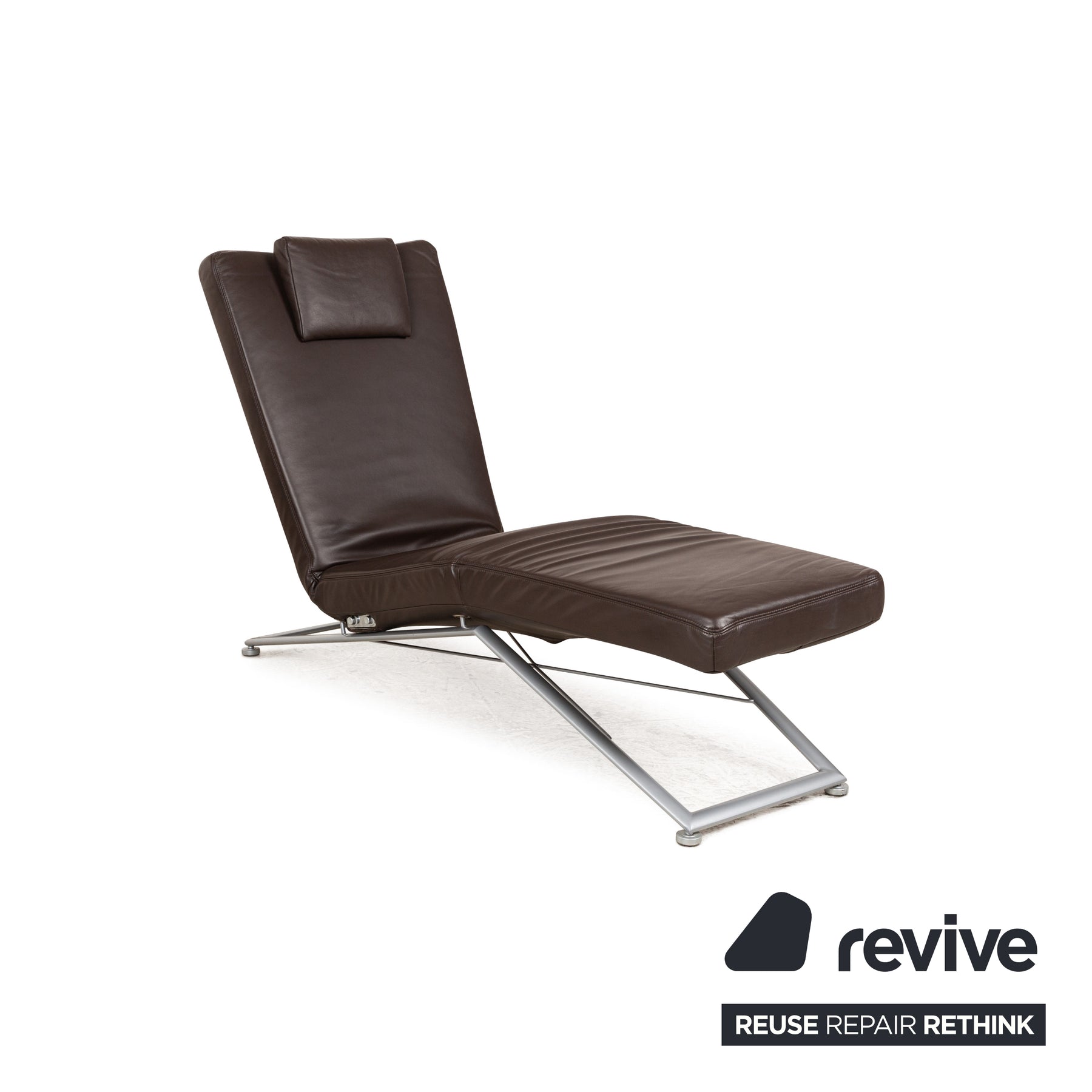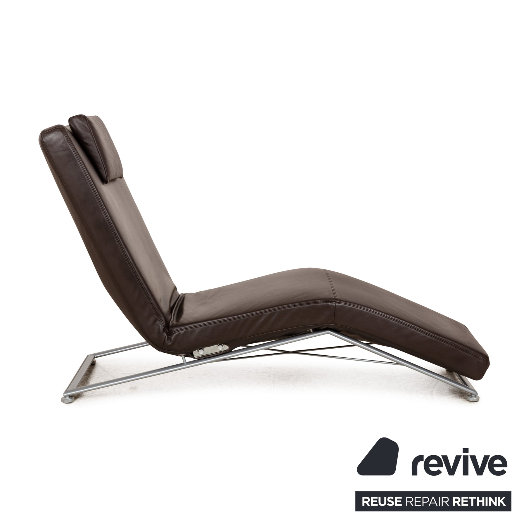 Die Liege Jeremiah vom deutschen Hersteller Koinor ist mit braunem Leder bezogen und steht auf einem filigranen Metallgestell. Eine ergonomische Formsprache und eine schlanke Optik prägen das Design. Für mehr Komfort kann die Liege in eine Relaxposition gebracht werden.