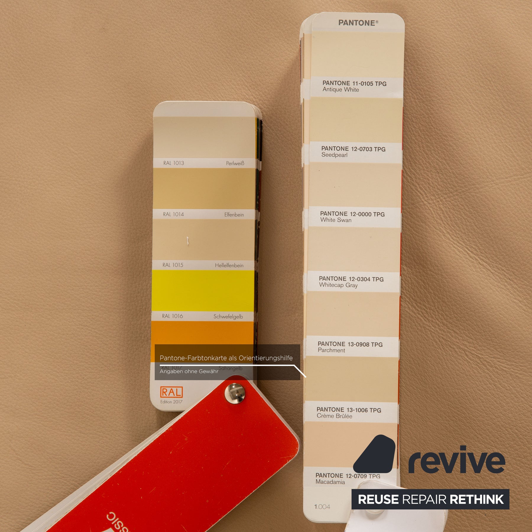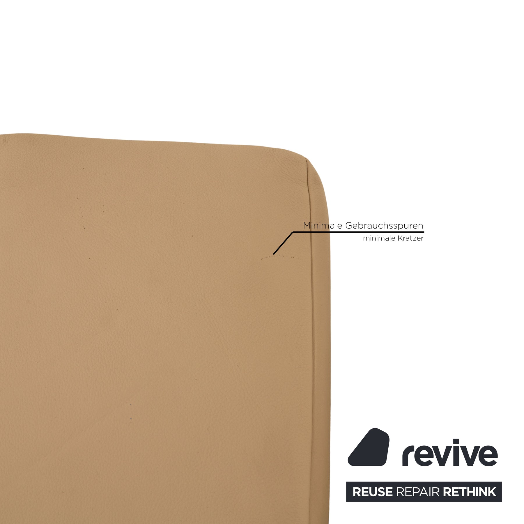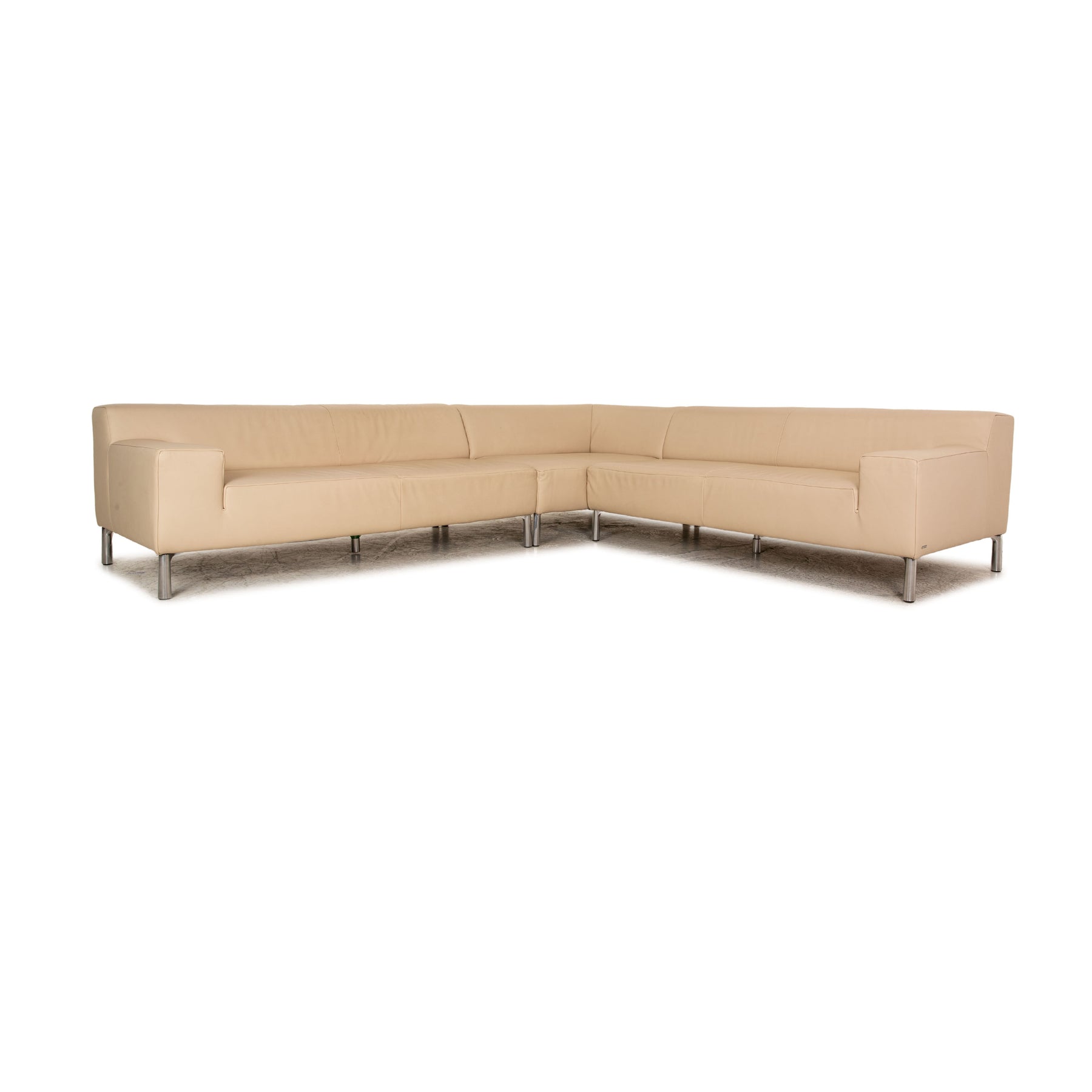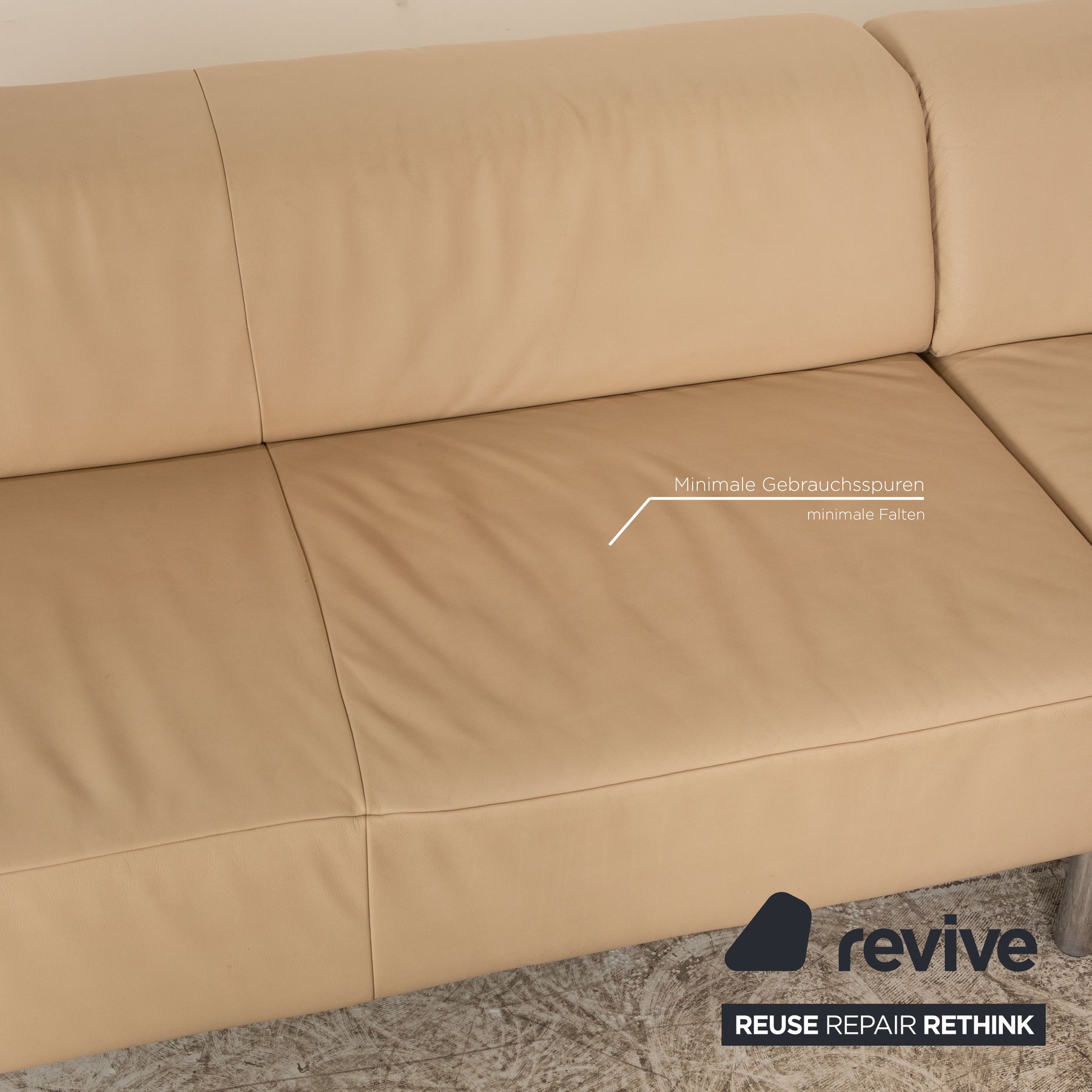 Das Ecksofa von Koinor ist mit einem cremefarbenen Echtleder bezogen und steht auf kleinen Metallfüßen. Das Sofa zeichnet sich durch das klassische, zeitlose Design und die abgerundete Sitzfläche aus.