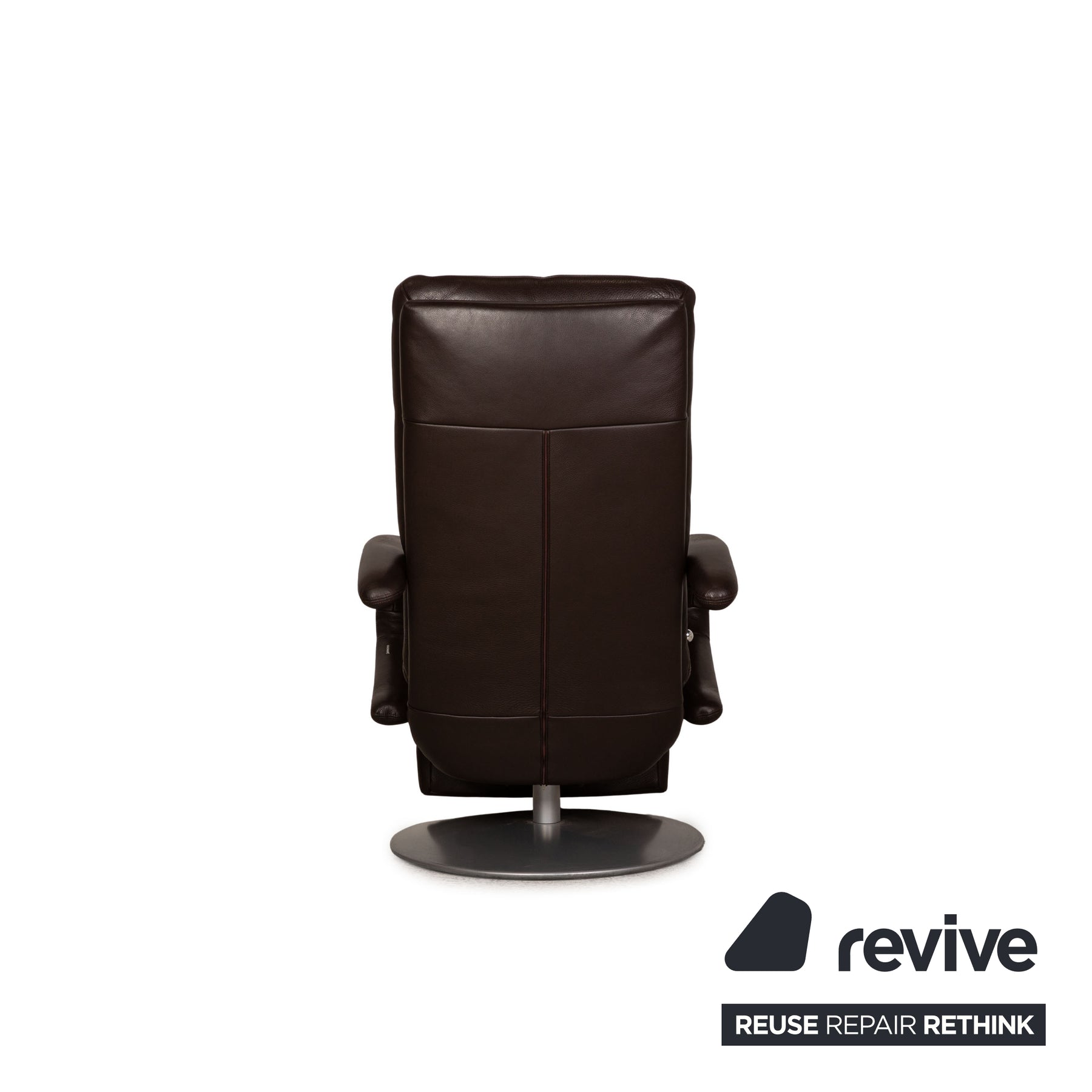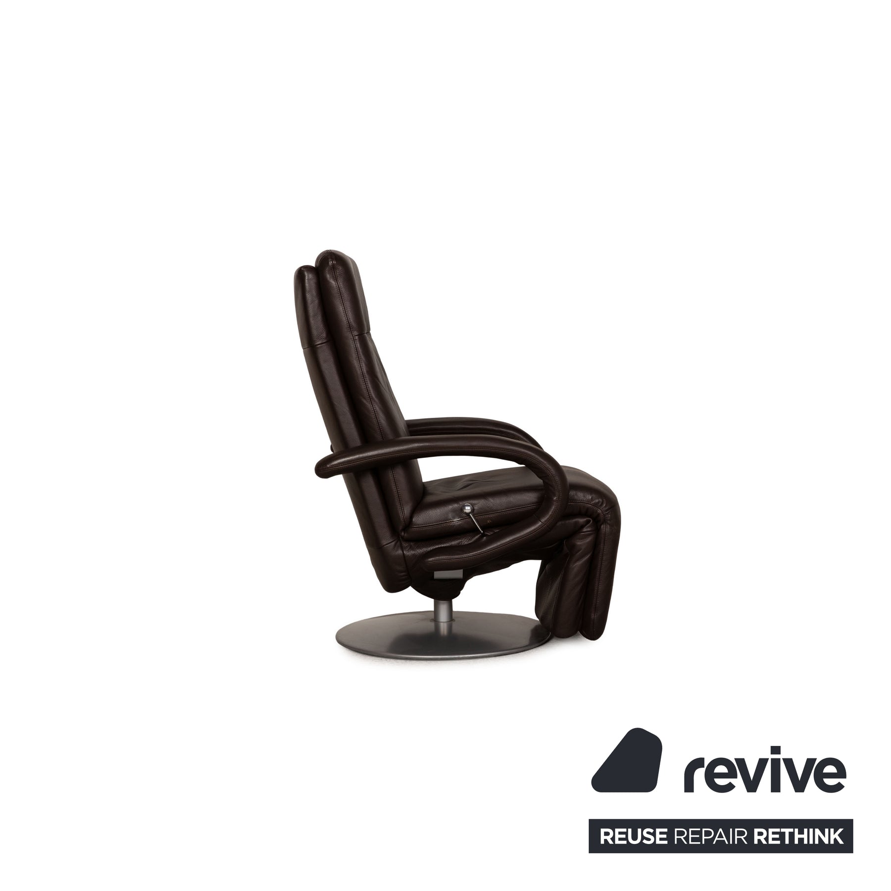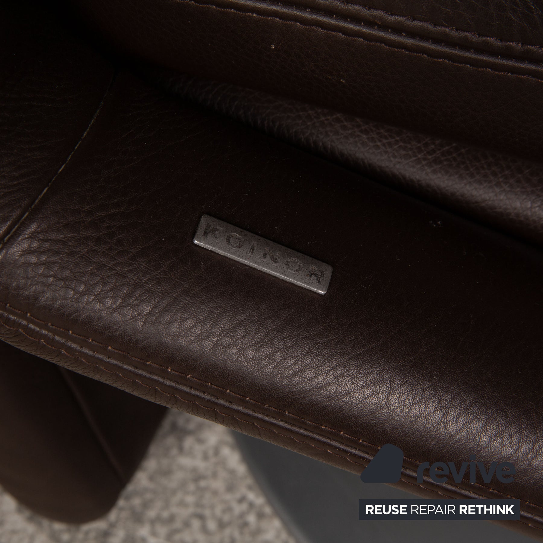 Der Koinor Sessel ist mit einem braunen Echtleder bezogen und steht auf einem runden Metallfuß. Das schlichte, zeitlose Design und die praktische Relaxfunktion zeichnen ihn aus.