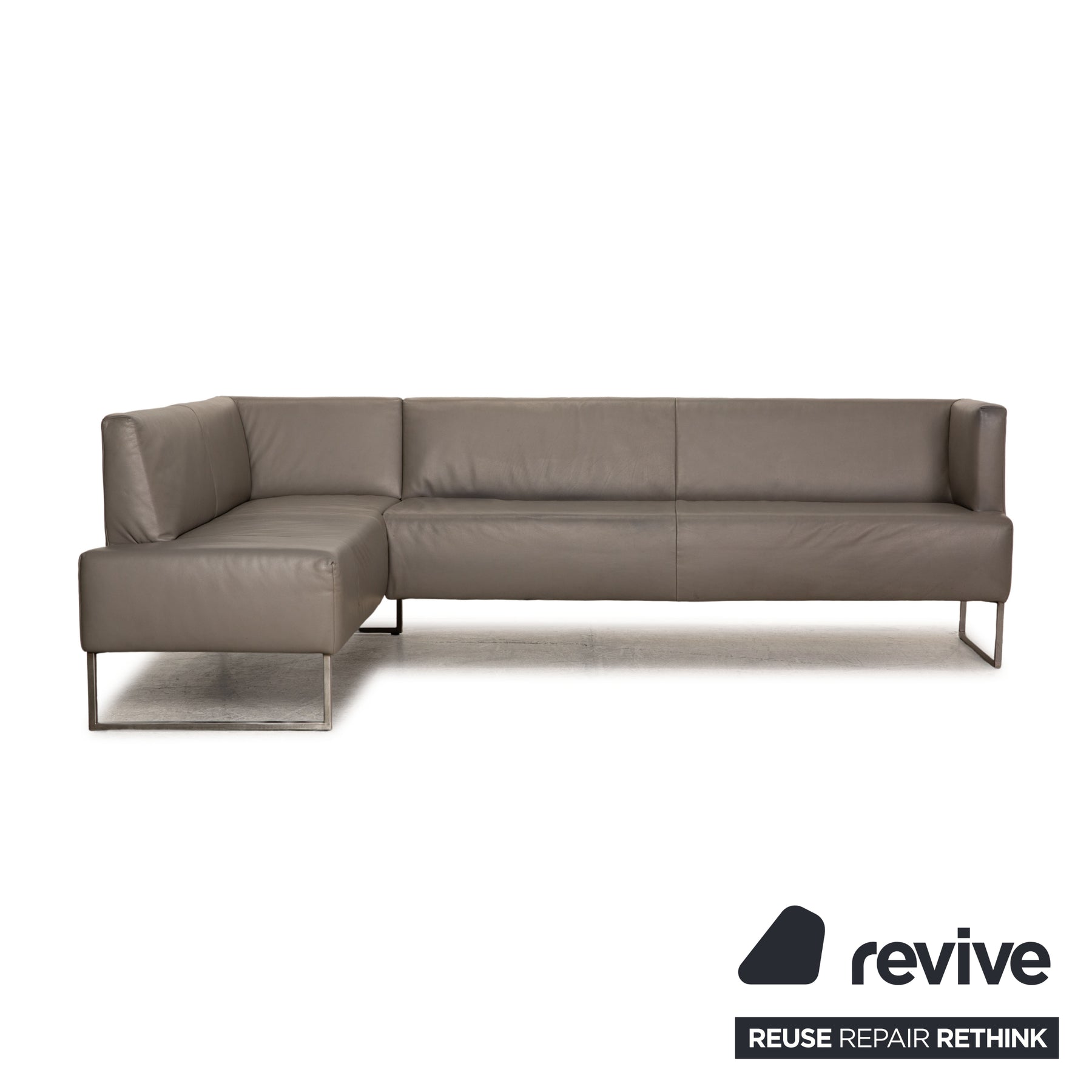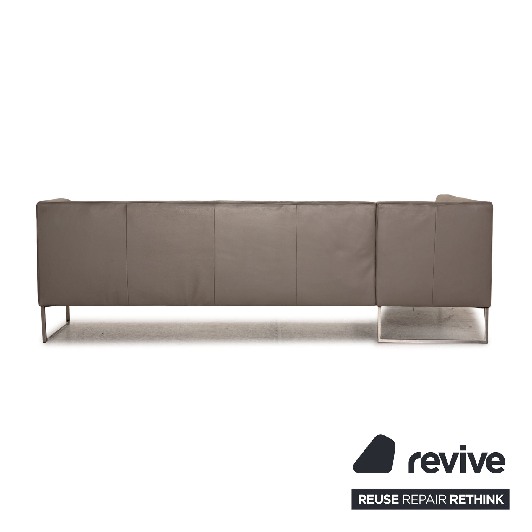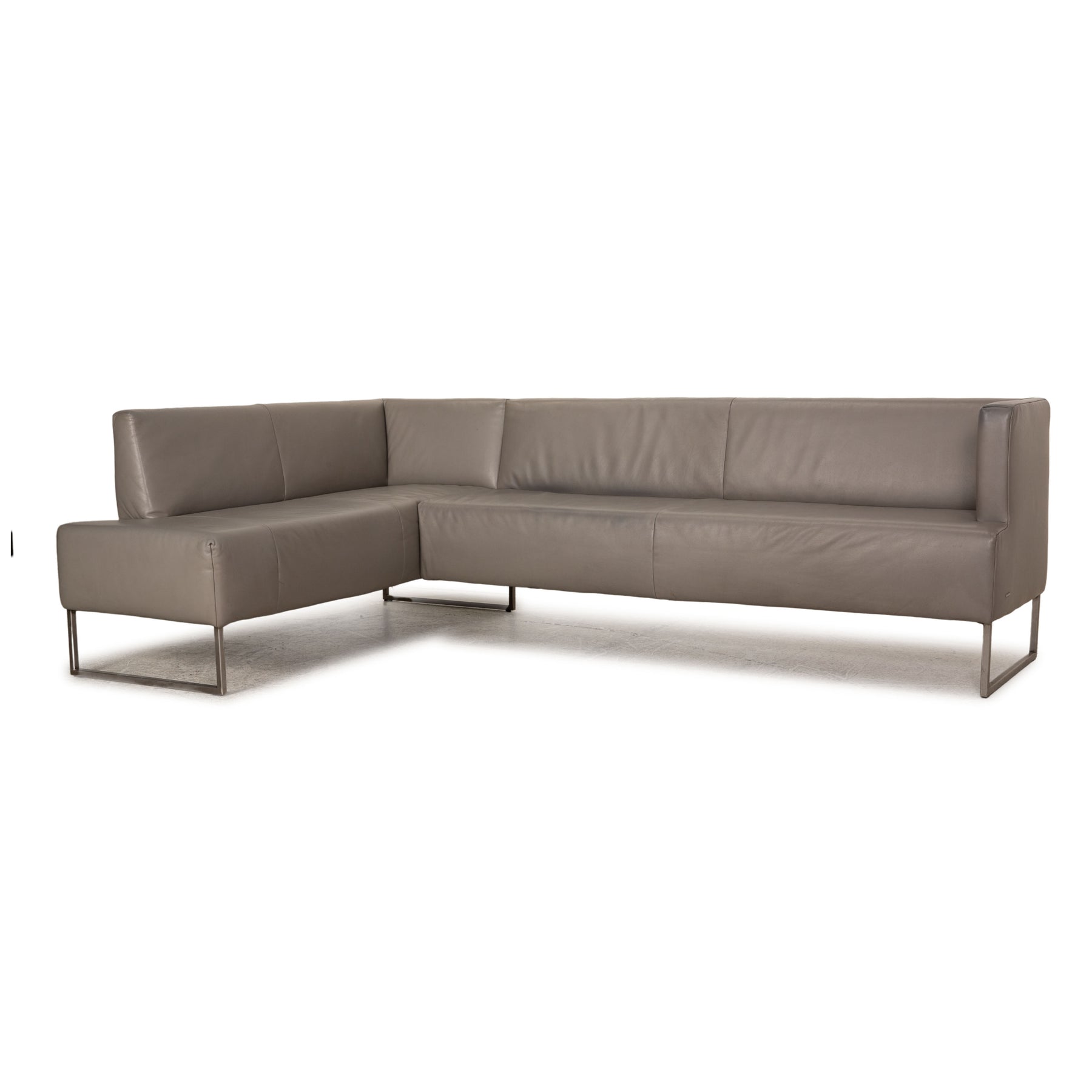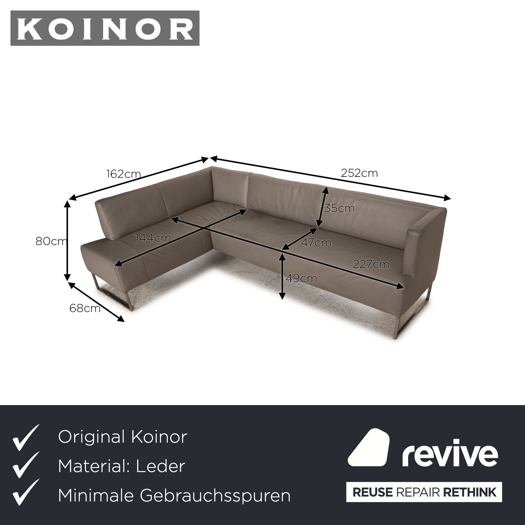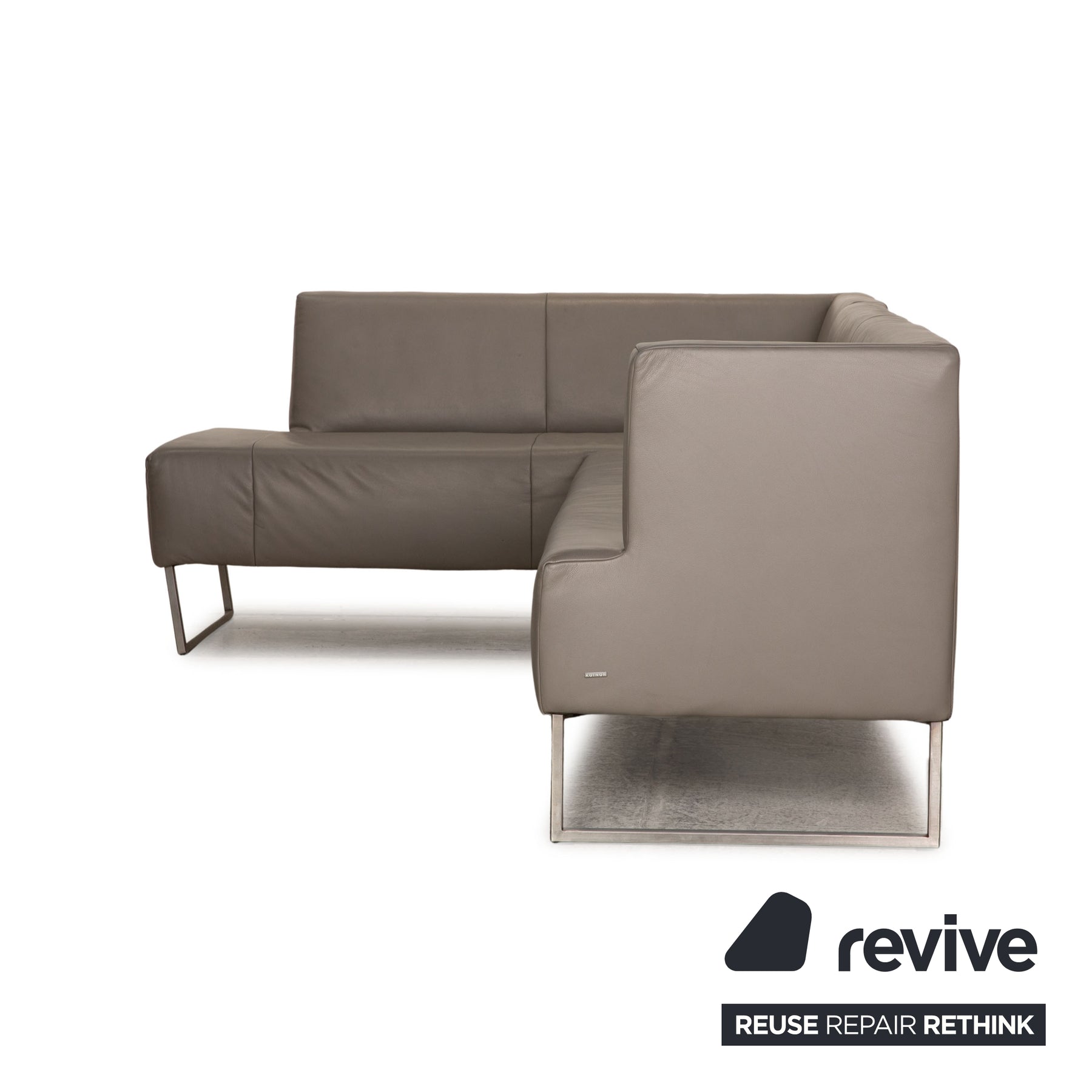 Das Ecksofa von Koinor ist mit einem grauen Echtleder bezogen und steht auf schmalen Metallfüßen. Es zeichnet sich durch das gradlinige, kantige Design und die schlichte, zeitlose Optik aus.