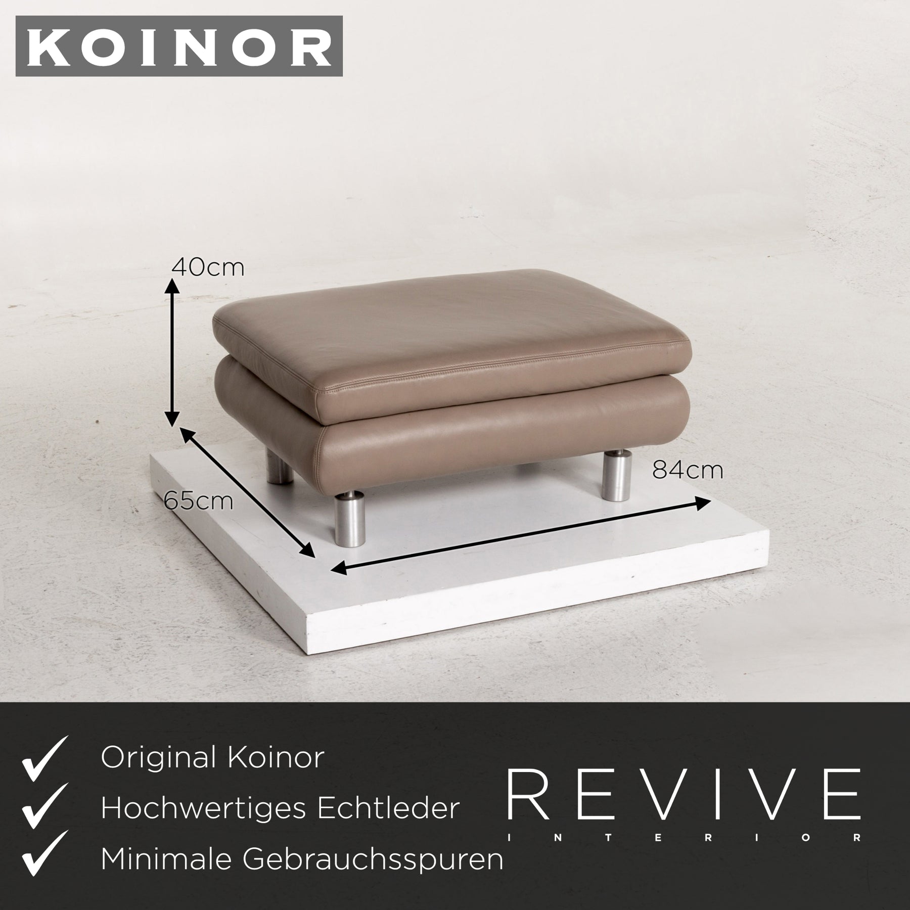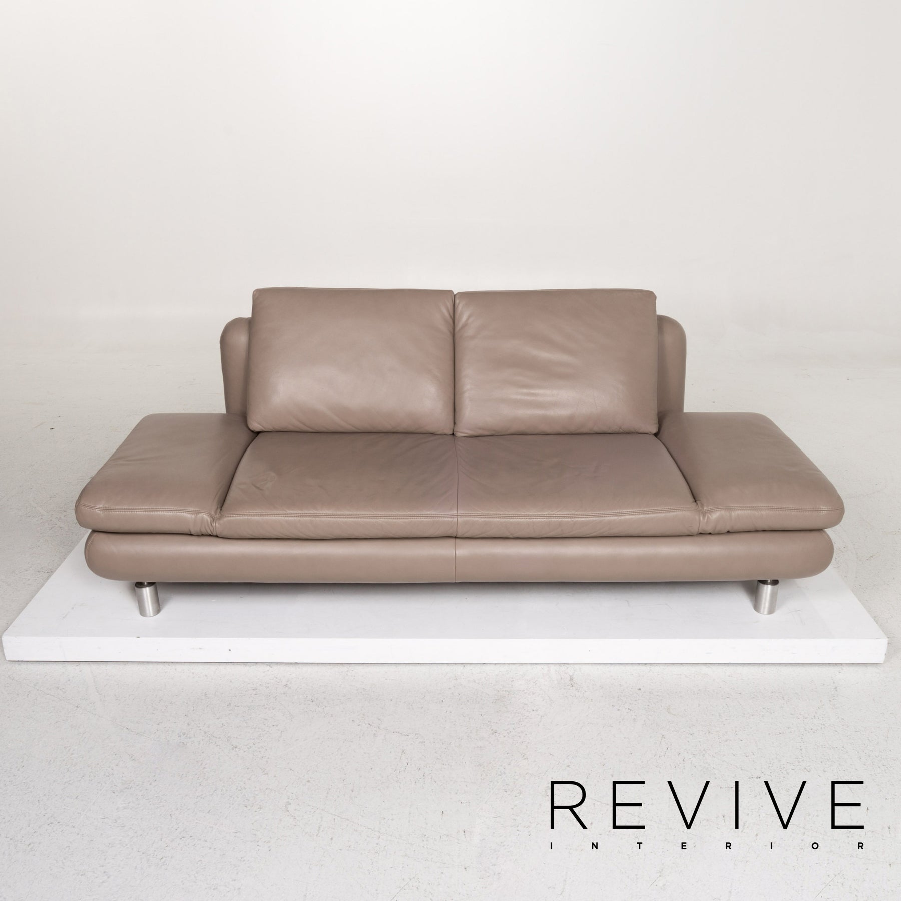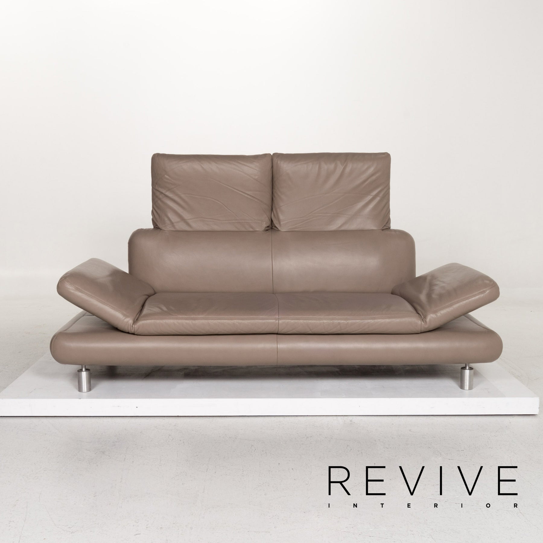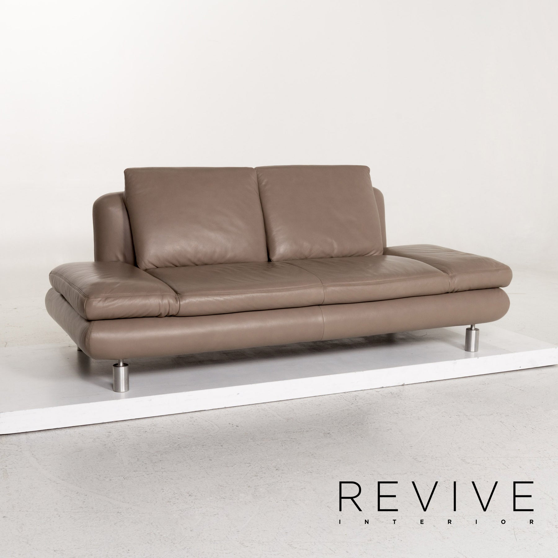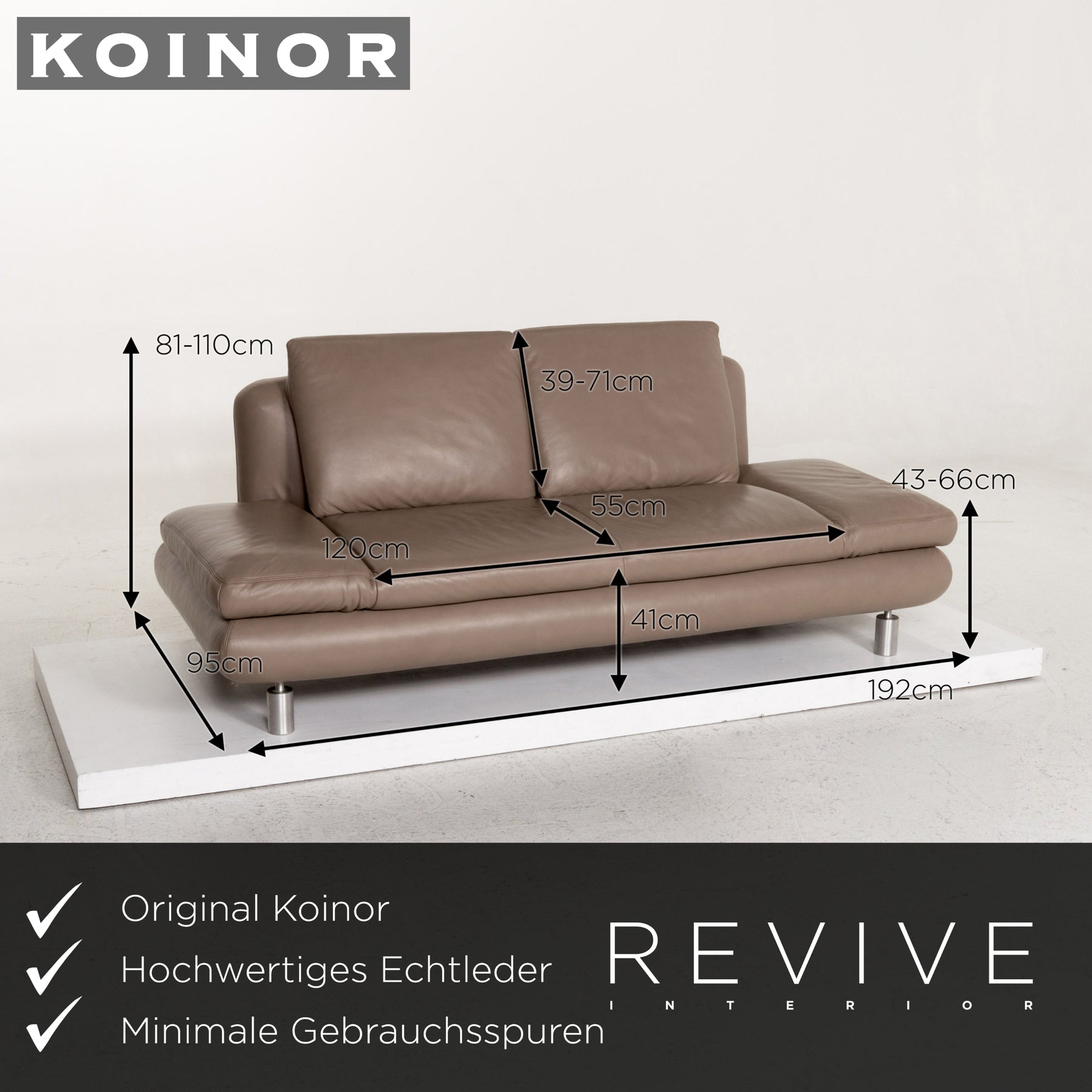 Die Garnitur von Koinor ist mit einem graubeige-farbenem Echtleder bezogen und steht auf schlanken, auffälligen Metallfüßen. Das gradlinige, schlichte Design zeichnet die Modelle aus. Die Rückenpolster bei Drei- und Zweisitzer können für mehr Komfort nach oben geschoben und die Armlehnen hochgeklappt werden.