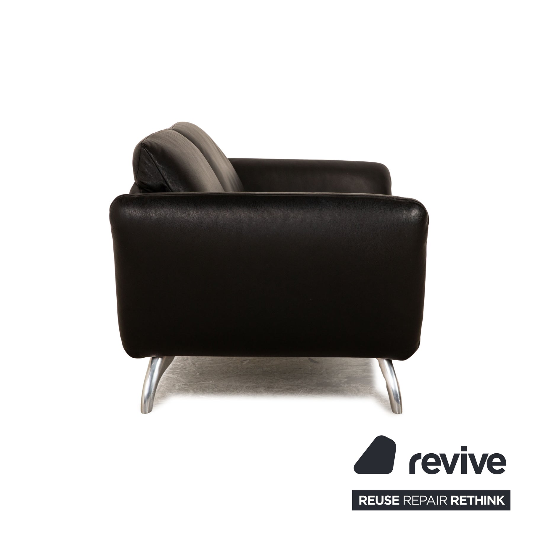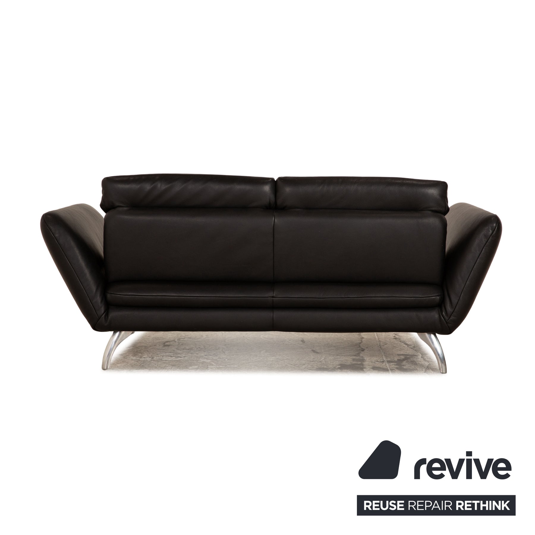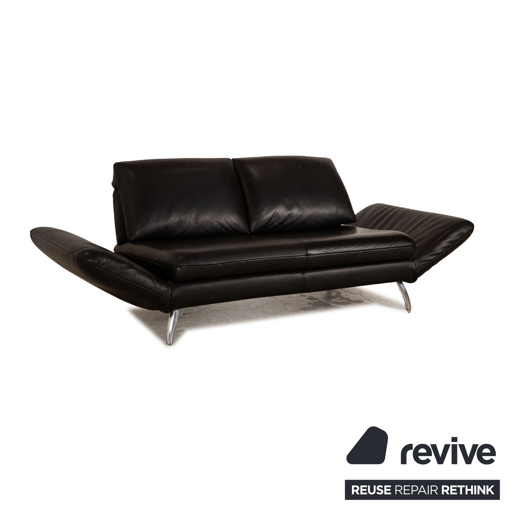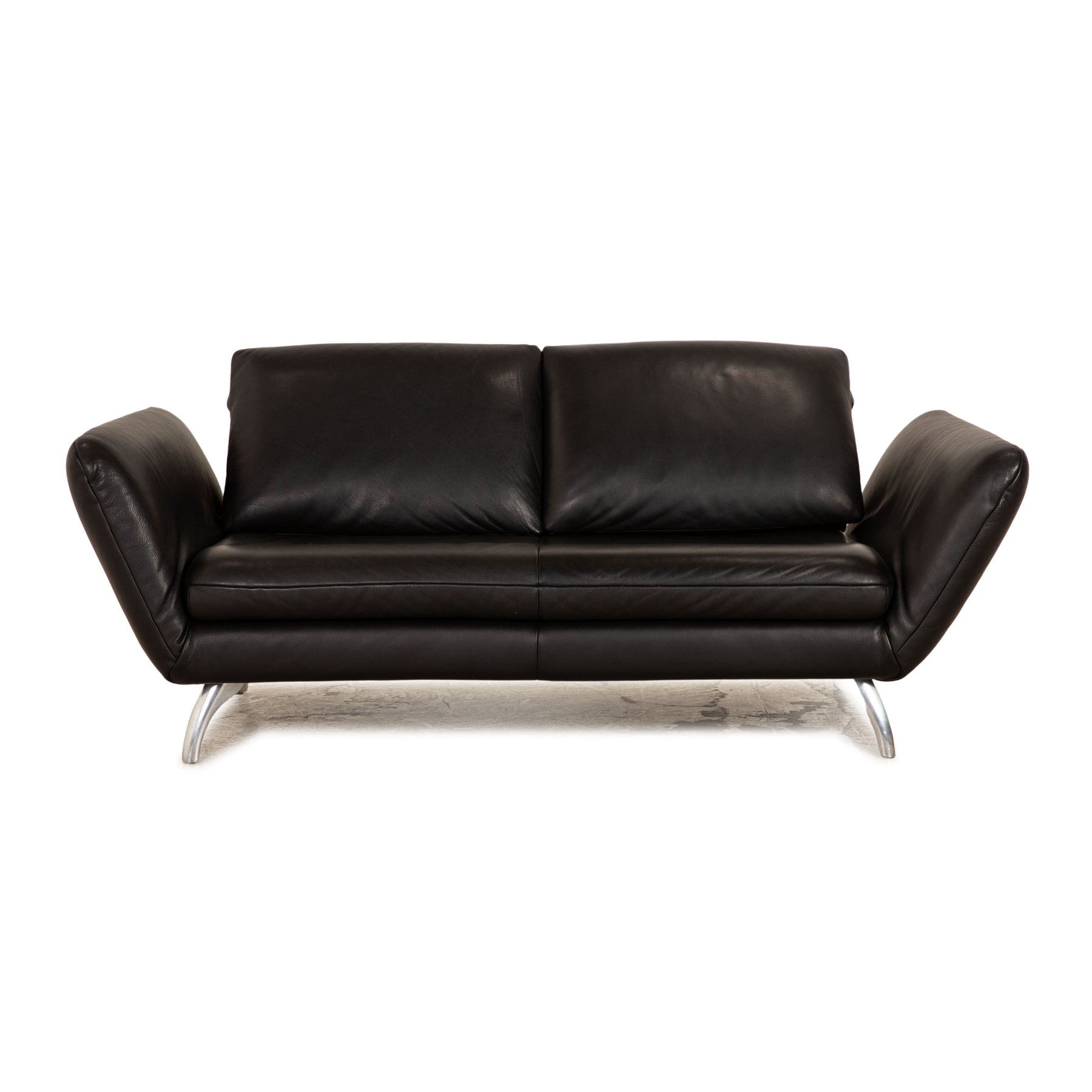 Das Koinor Sofa ist mit einem schwarzen Echtleder bezogen und steht auf silbernen Metallfüßen. Das klassische Design und die verstellbaren Armlehnen zeichnen den Zweisitzer aus.