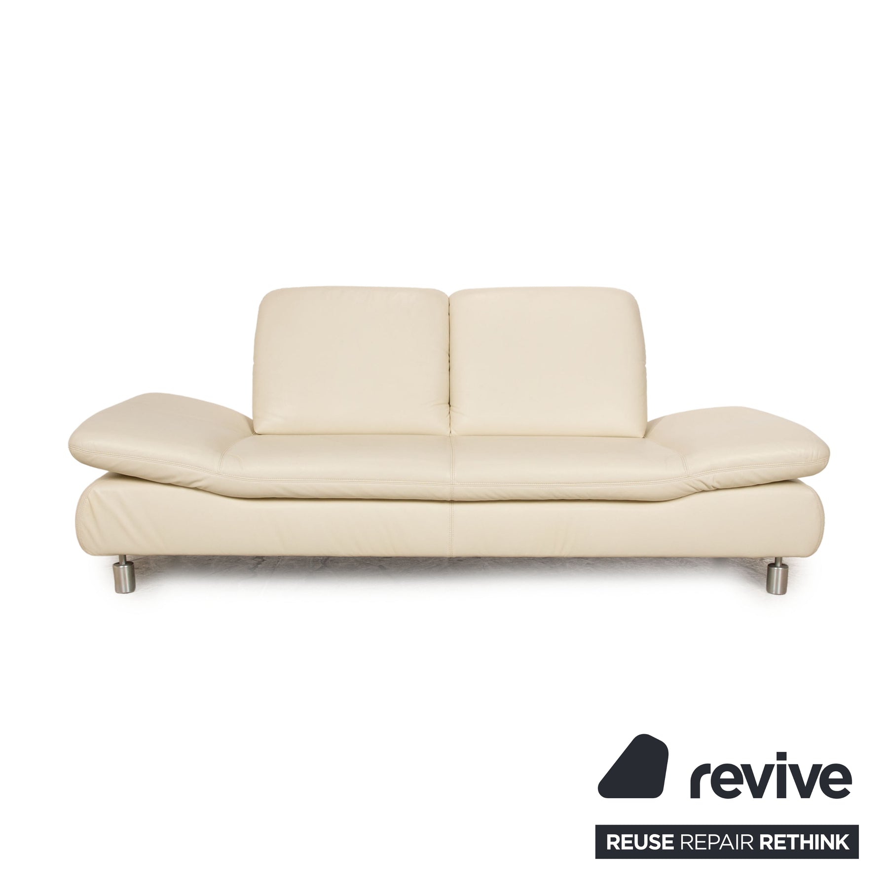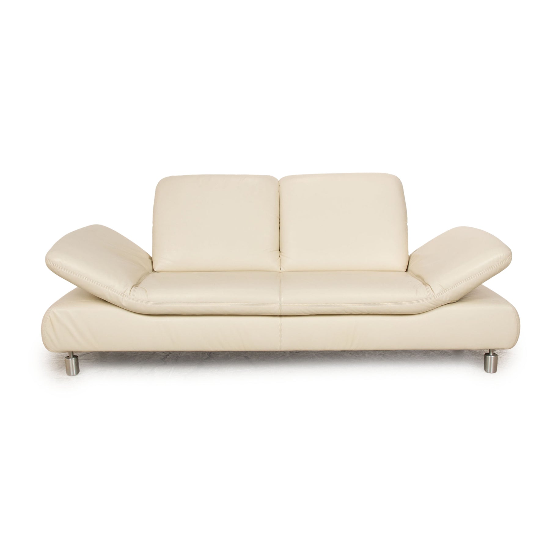 Das Rivoli Sofa von Koinor ist mit einem cremefarbenen Echtleder bezogen und steht auf runden Metallfüßen. Die verstellbaren Kopf- und Armlehnen zeichnen den Zweisitzer aus.