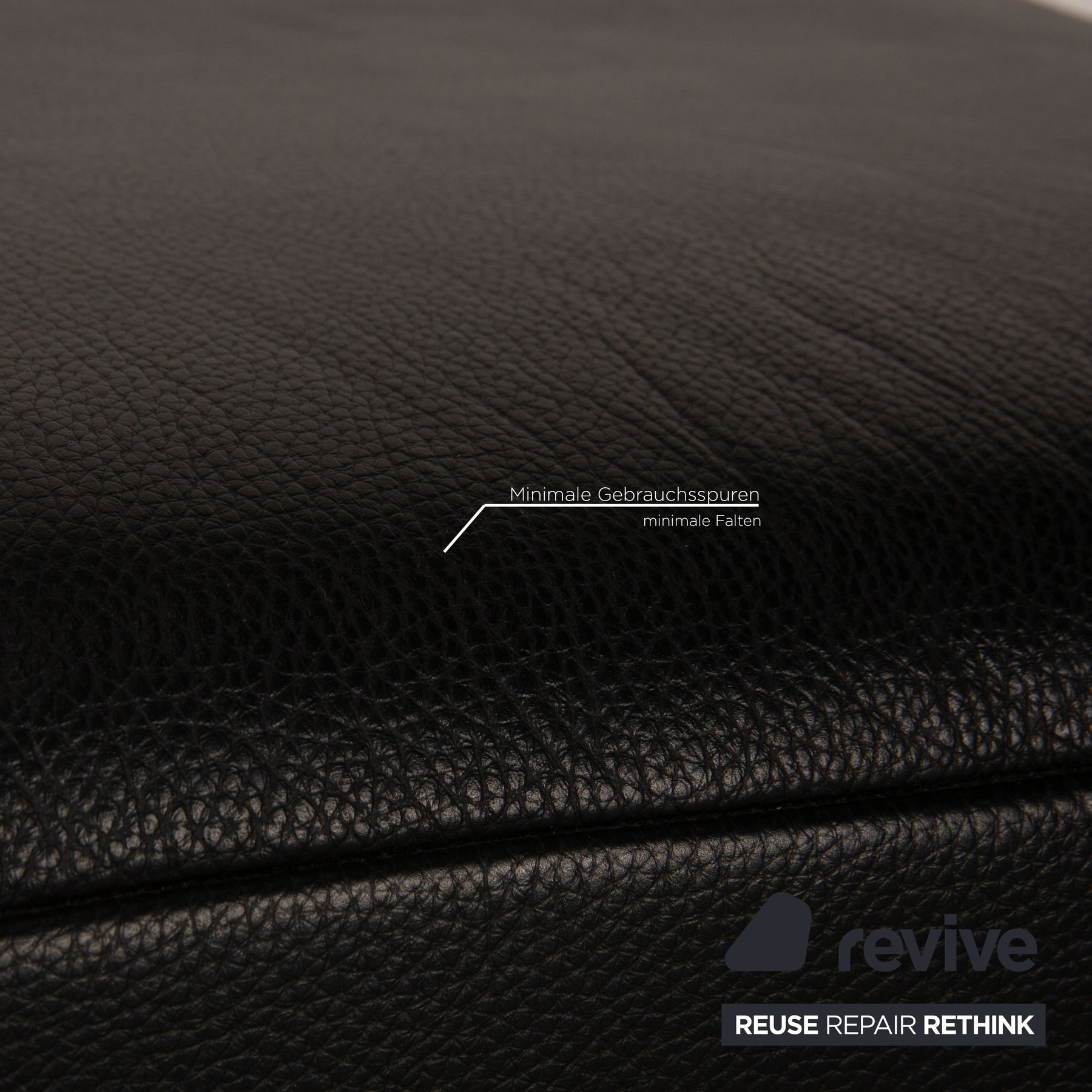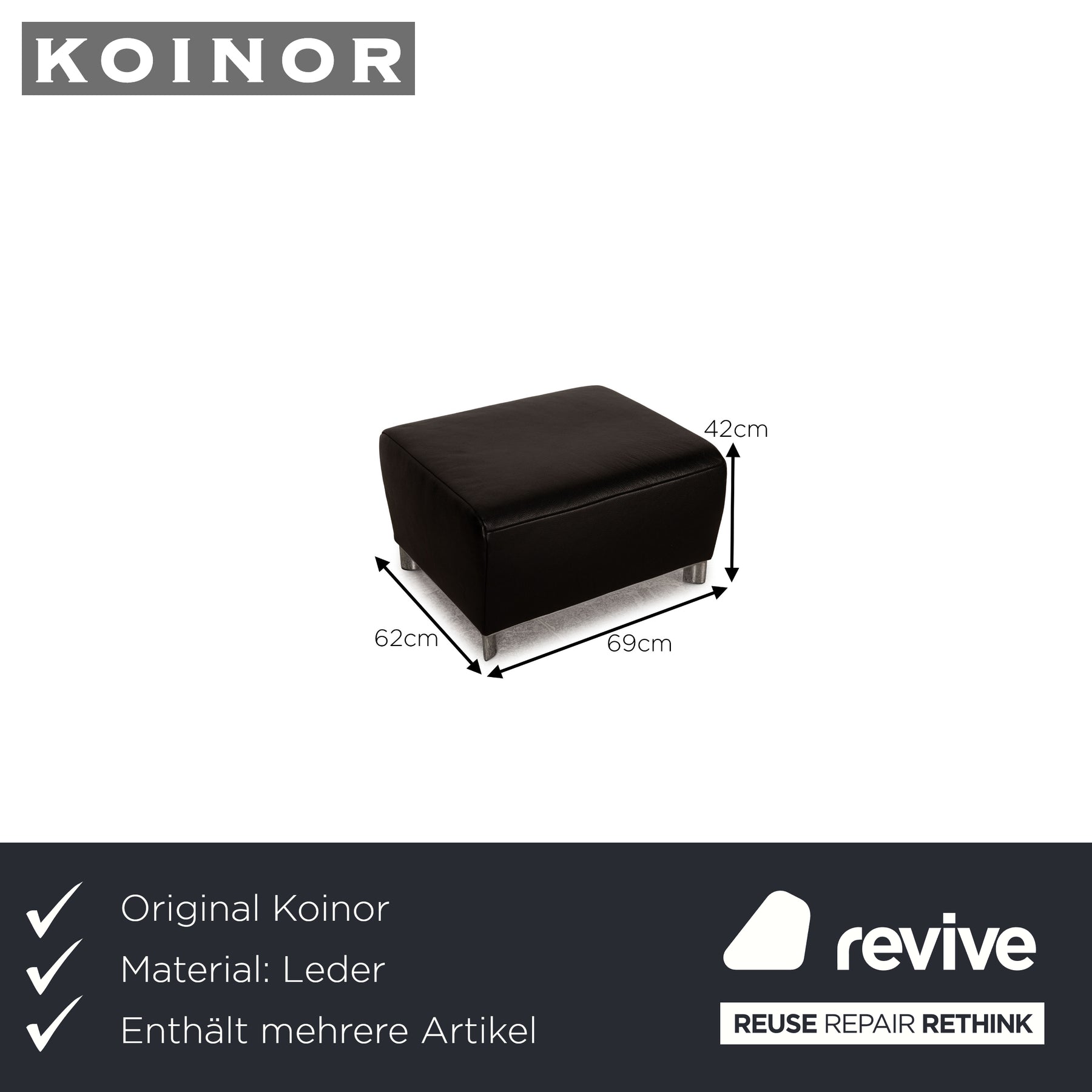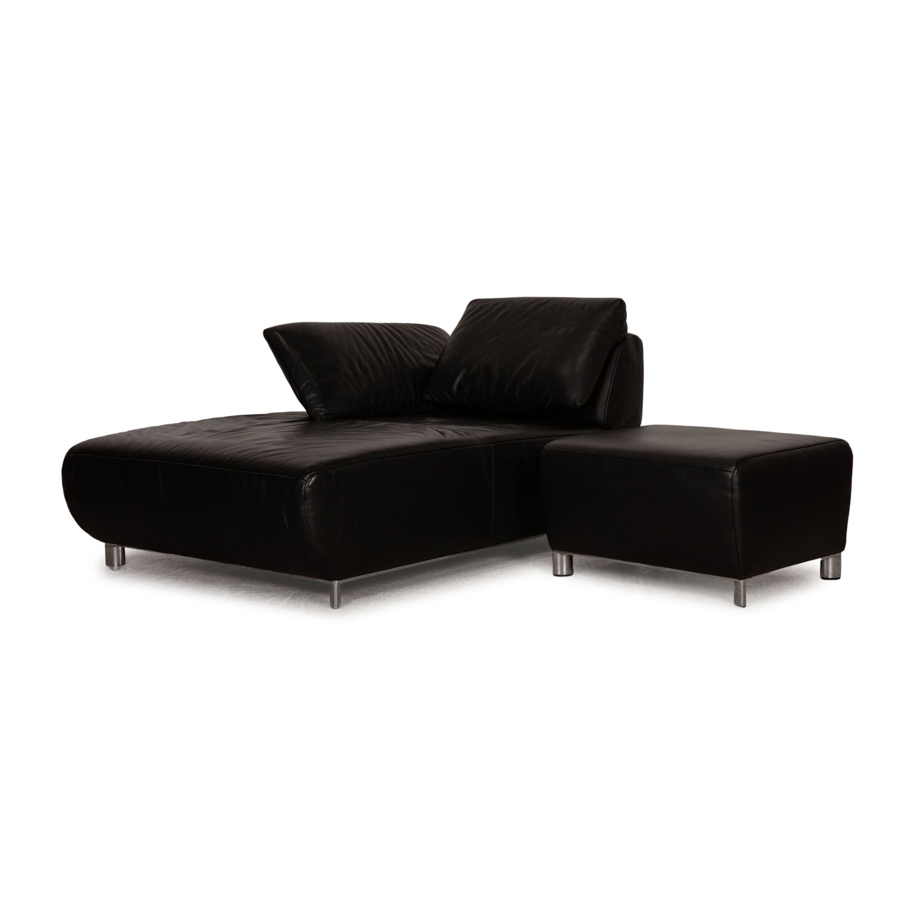 Die Garnitur Volare von Koinor ist mit einem schwarzen Echtleder bezogen und steht auf schmalen Metallfüßen. Sie zeichnet sich durch das schlichte, klassische Design und die zeitlose Optik aus. Sie besteht aus einer Liege und einem Hocker.