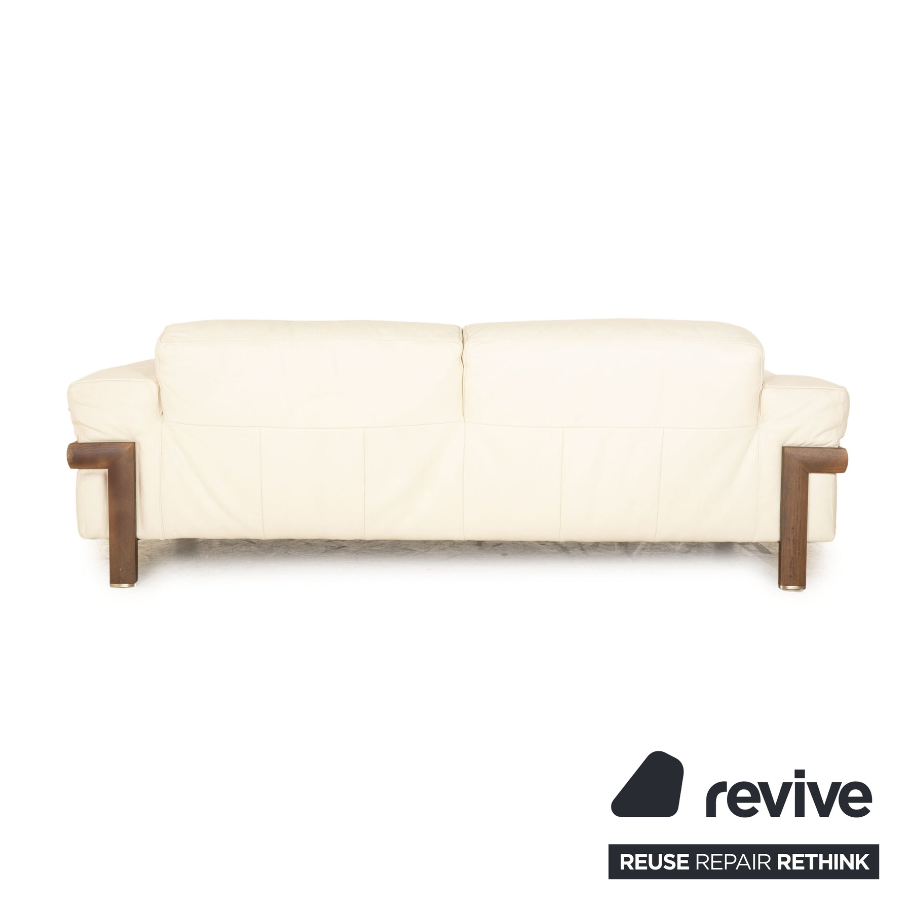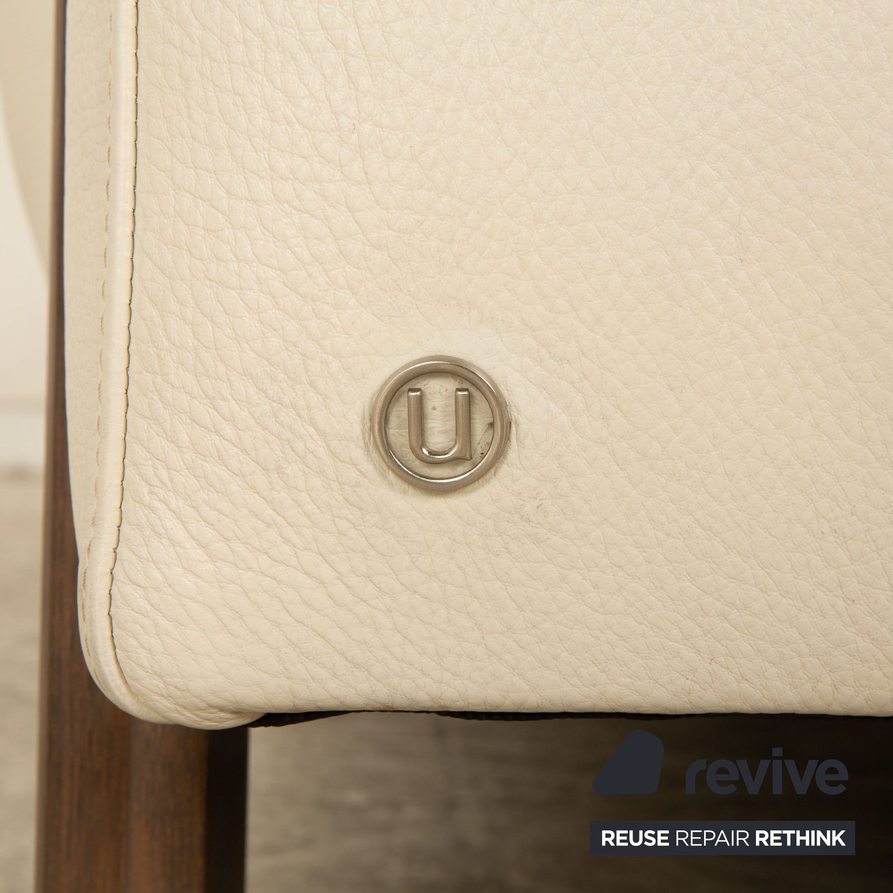 Der Zweisitzer von Natuzzi ist mit einem cremefarbenen Echtleder bezogen und steht auf zwei seitlich um die Armlehnen laufenden Holzfüßen.  Er überzeugt durch sein schlichtes, helles Design und die Holzakzente. Der freundliche Stil findet in jedem Raum einen Platz und lädt zum relaxen ein.