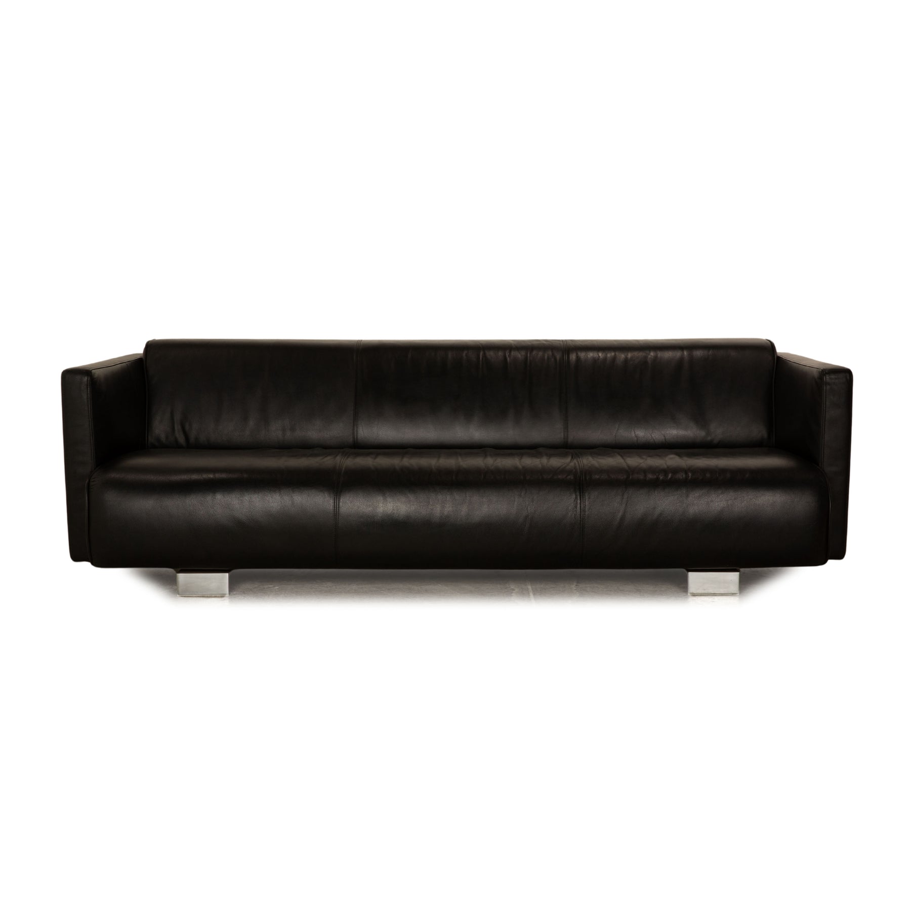 Der Dreisitzer 6300 von Rolf Benz ist mit einem schwarzen Echtleder bezogen und steht auf silbernen Metallfüßen. Er zeichnet sich durch das klassische Design und die schlichte, zeitlose Optik aus.