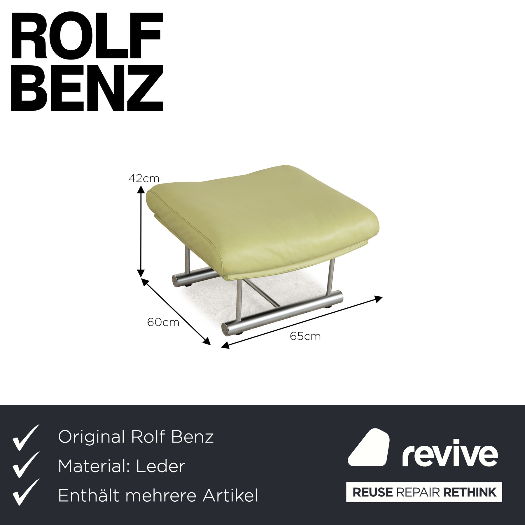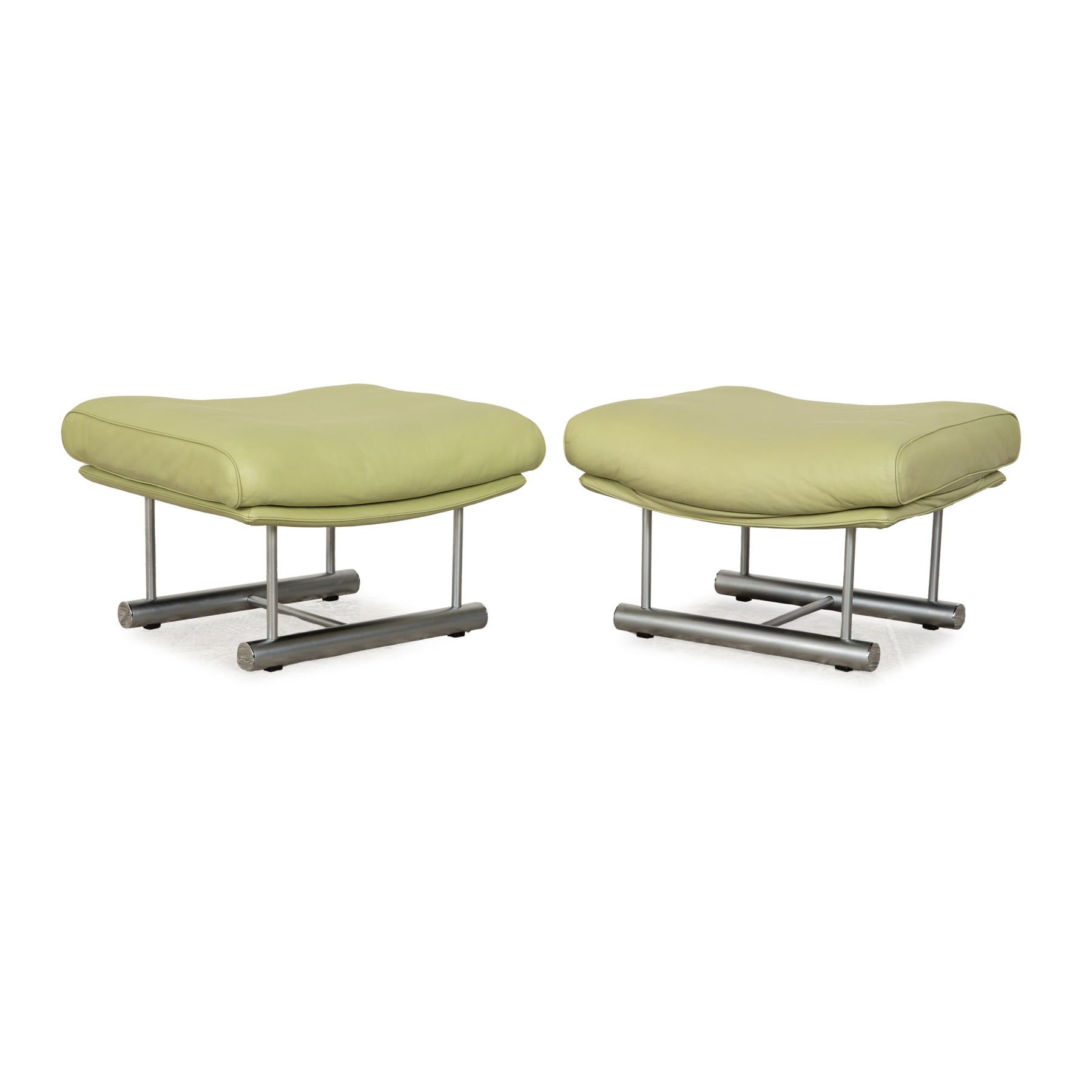 Die Garnitur aus der bekannten 6500-Reihe von Rolf Benz ist mit einem grünen Echtleder bezogen und steht auf silbernen Metallfüßen. Kantiges und markantes Design zeichnet sie aus. Die Garnitur besteht aus zwei Hockern.