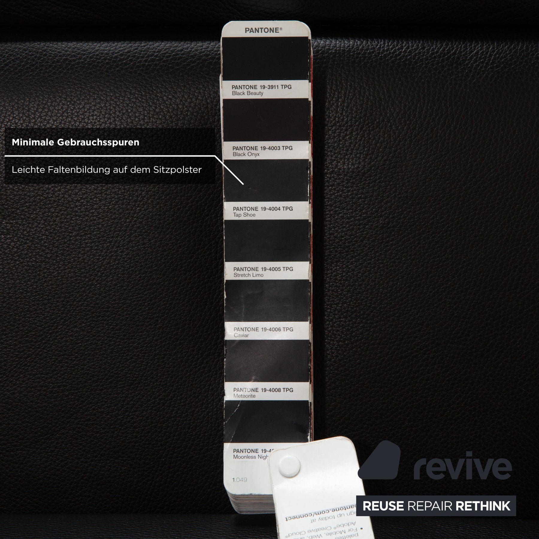 Der schwarze Lederbezug wirkt edel, zeitlos und hochwertig. Das fein verarbeitete Leder fühlt sich angenehm weich an, ist langlebig und unterstreicht den exklusiven Charakter des Sofas. Großzügige Sitzflächen und ergonomisch geformte Rückenlehnen sorgen für ein entspanntes Sitzgefühl auf höchstem Niveau.
